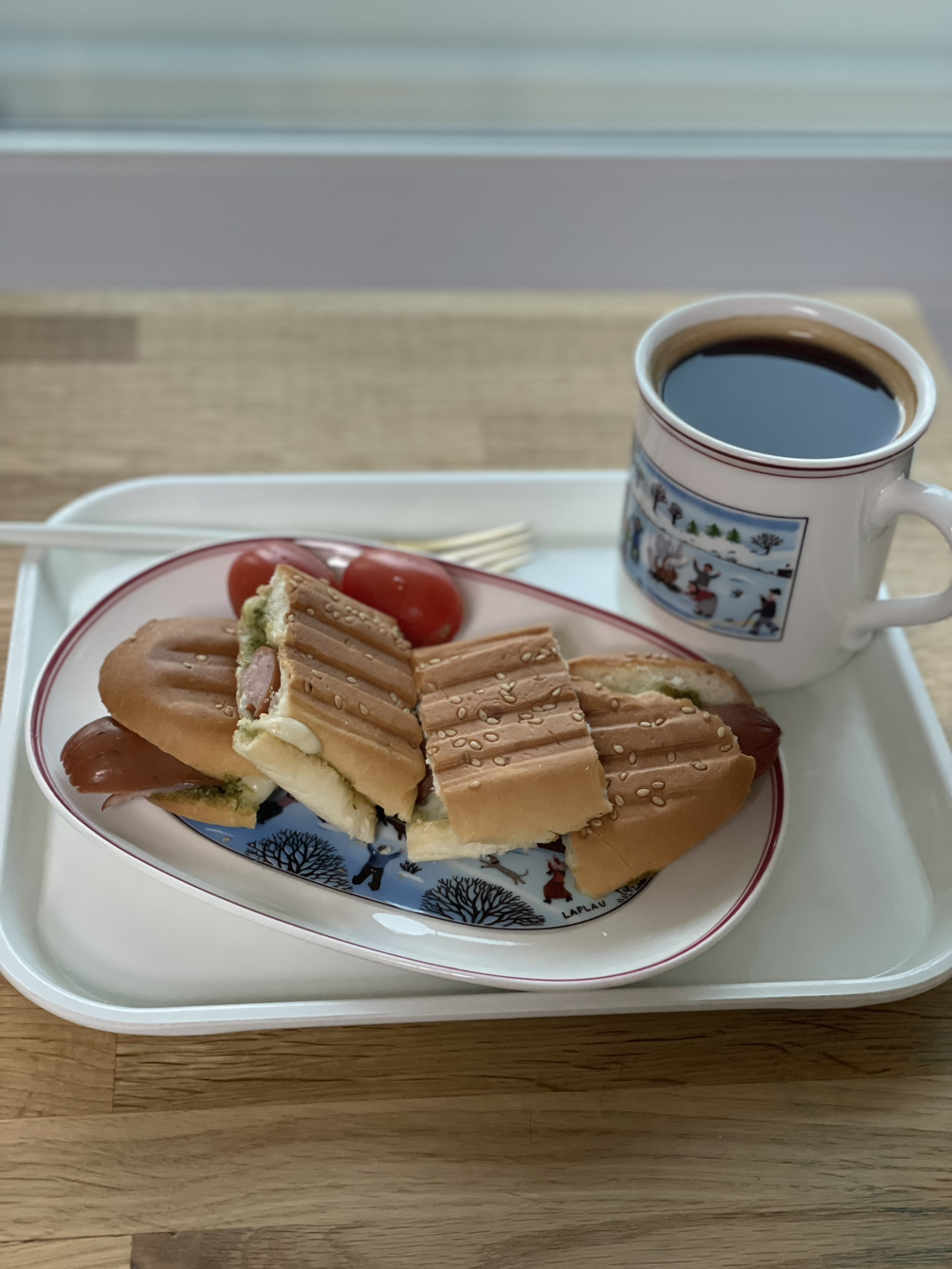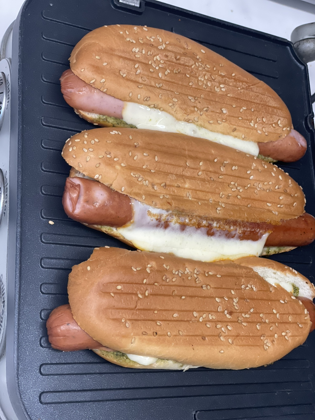 내친 김에 파니니도 한번 만들어보자. 오랜만에 파니니 그릴을 열어본다. 별다른 재료도 필요 없이 치즈와 소세지가 들은 짭짤 고소한 파니니. 핫도그빵에 바질페스토를 바르고 치즈와 소세지 반개를 넣어 노릇노릇 구워 먹으면 이게 바로 천상의 맛