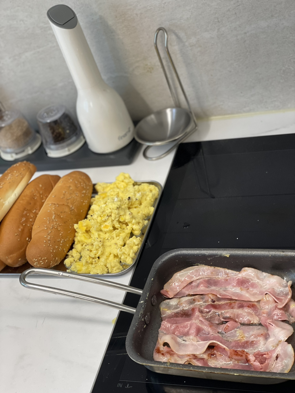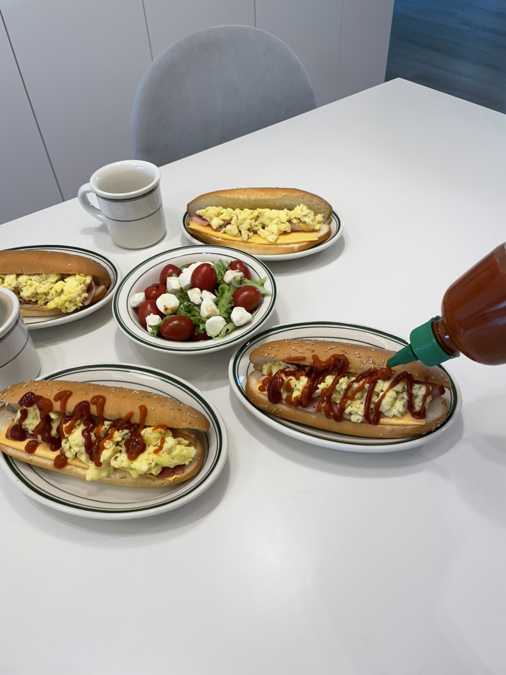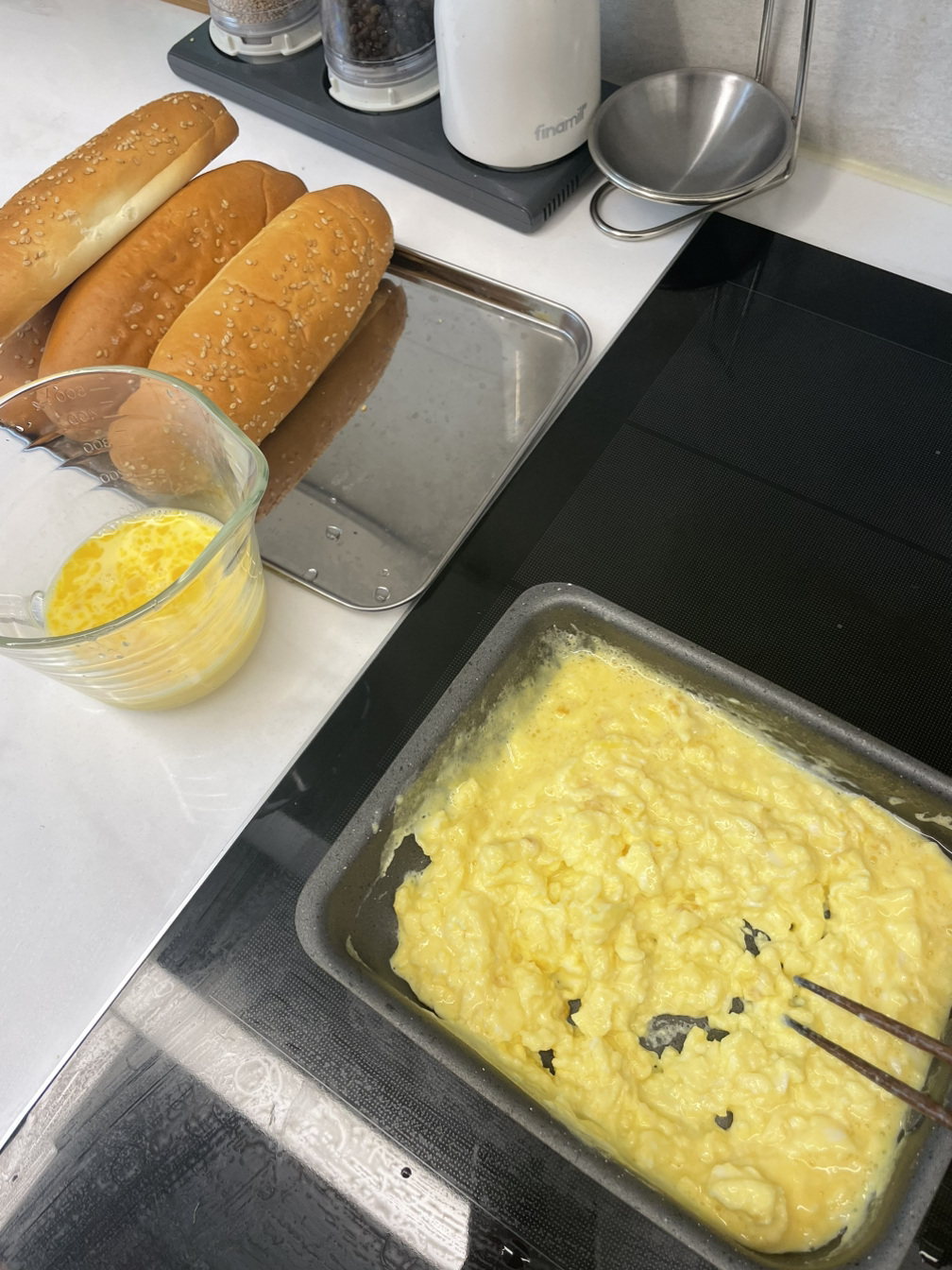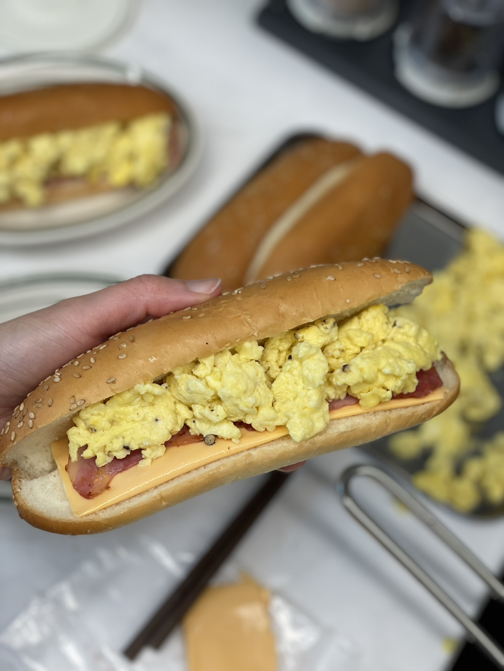 그 다음으로 내가 좋아하는 스크램블 에그와 베이컨을 넣어 간단한 브런치 메뉴를 만들어 보았다. 핫도그빵에 체다치즈 한 장 넣고 노릇노릇 구운 베이컨을 얹은 후 보들보들한 스크램블 에그로 속을 꼭꼭 채운다. 그리고 케첩과 소스를 뿌려서 먹기.