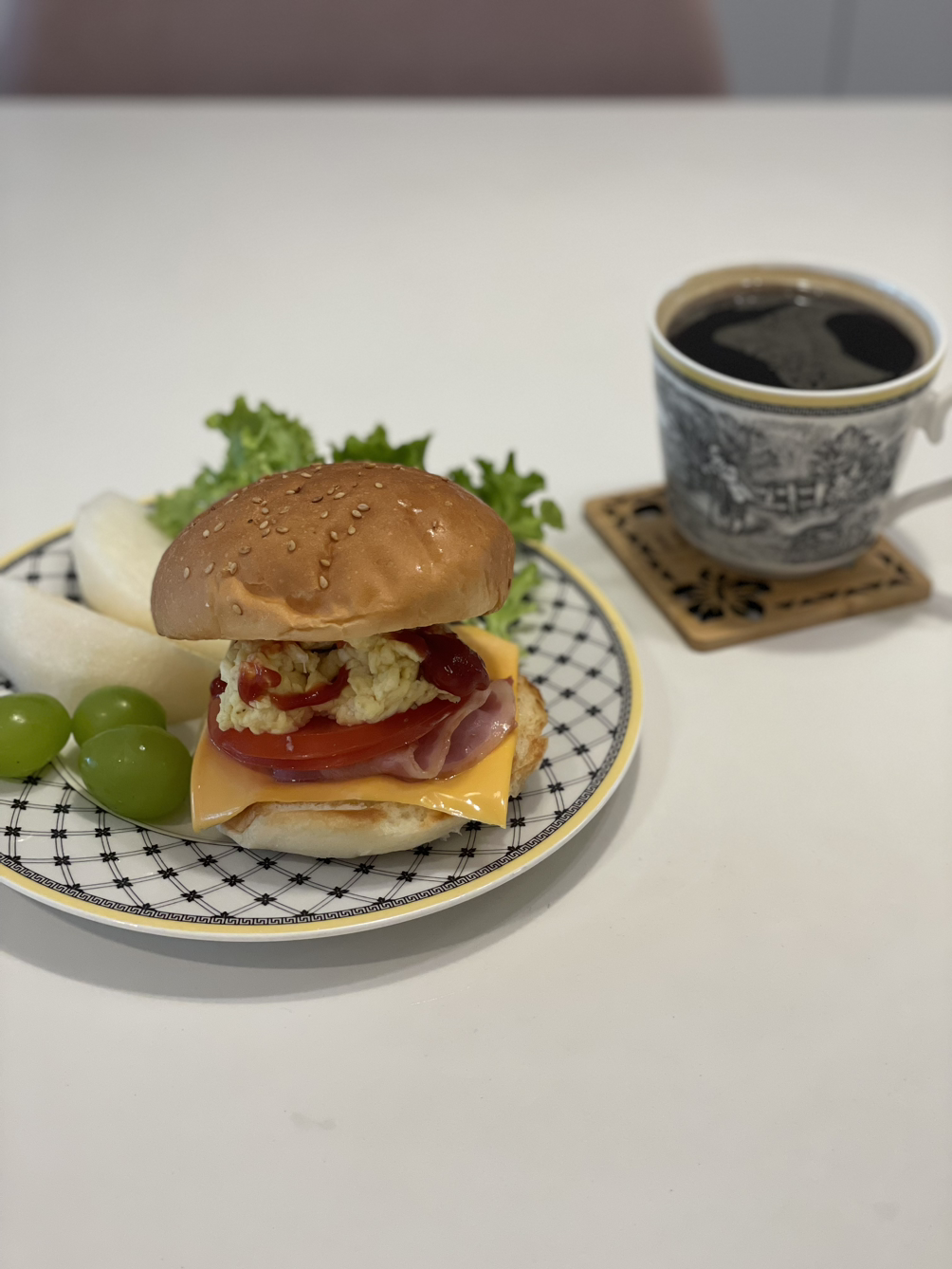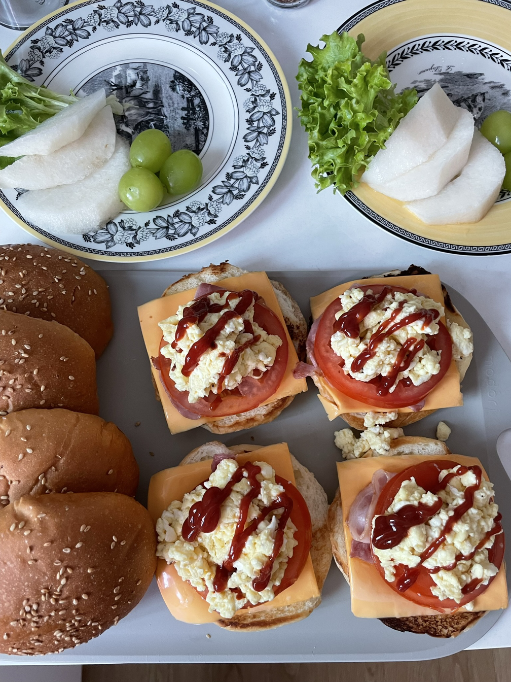 햄버거빵이 아직 남아 있으니 다음날은 응용을 해보았다. 비슷한 과정으로 만들되 고기패티 대신에 스크램블 에그와 베이컨을 넣었더니 근사한 브런치 요리가 되었다.