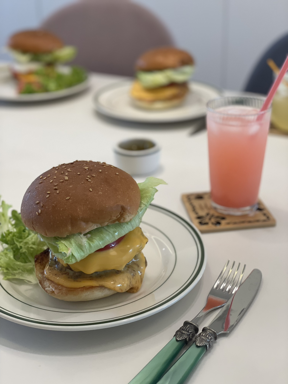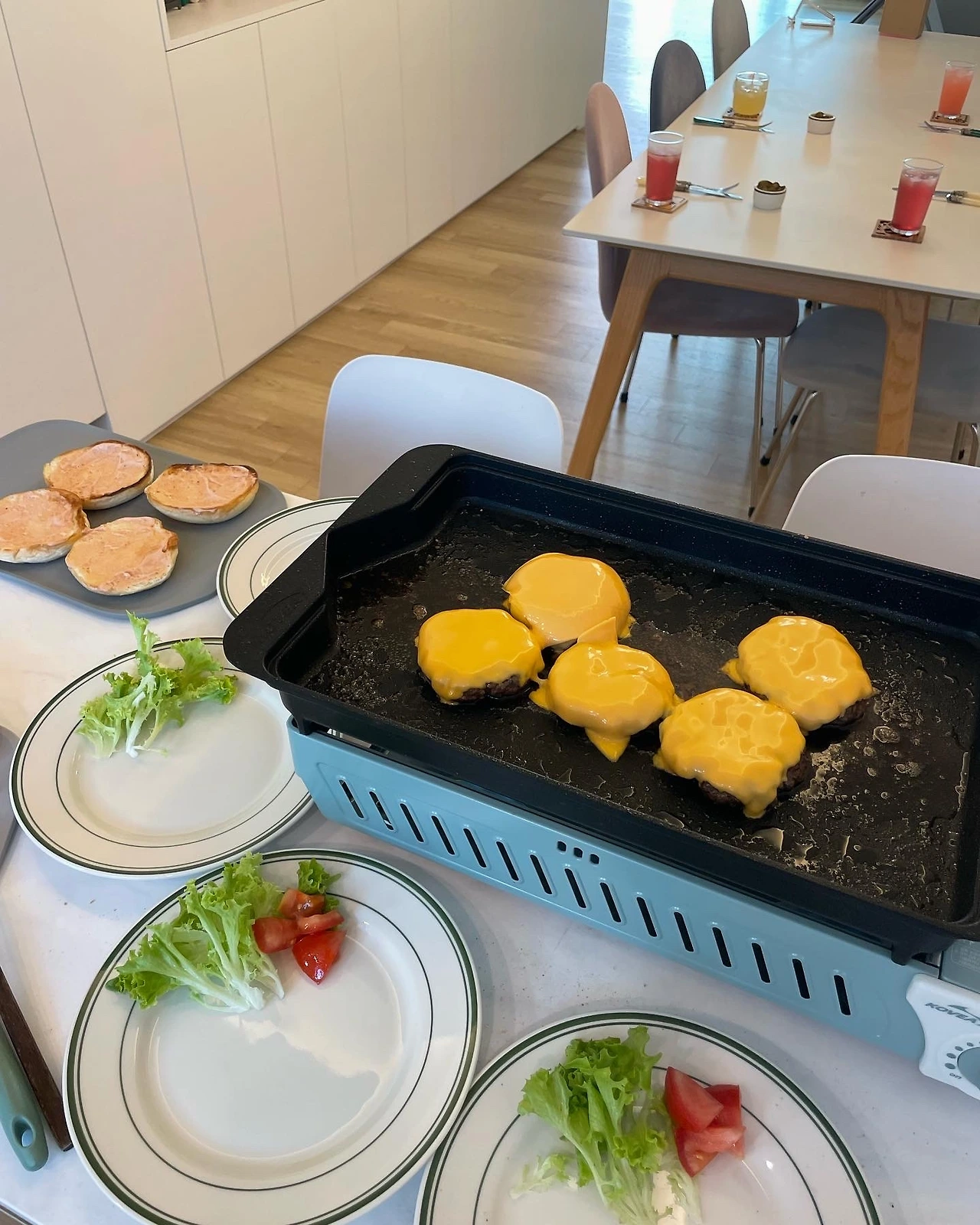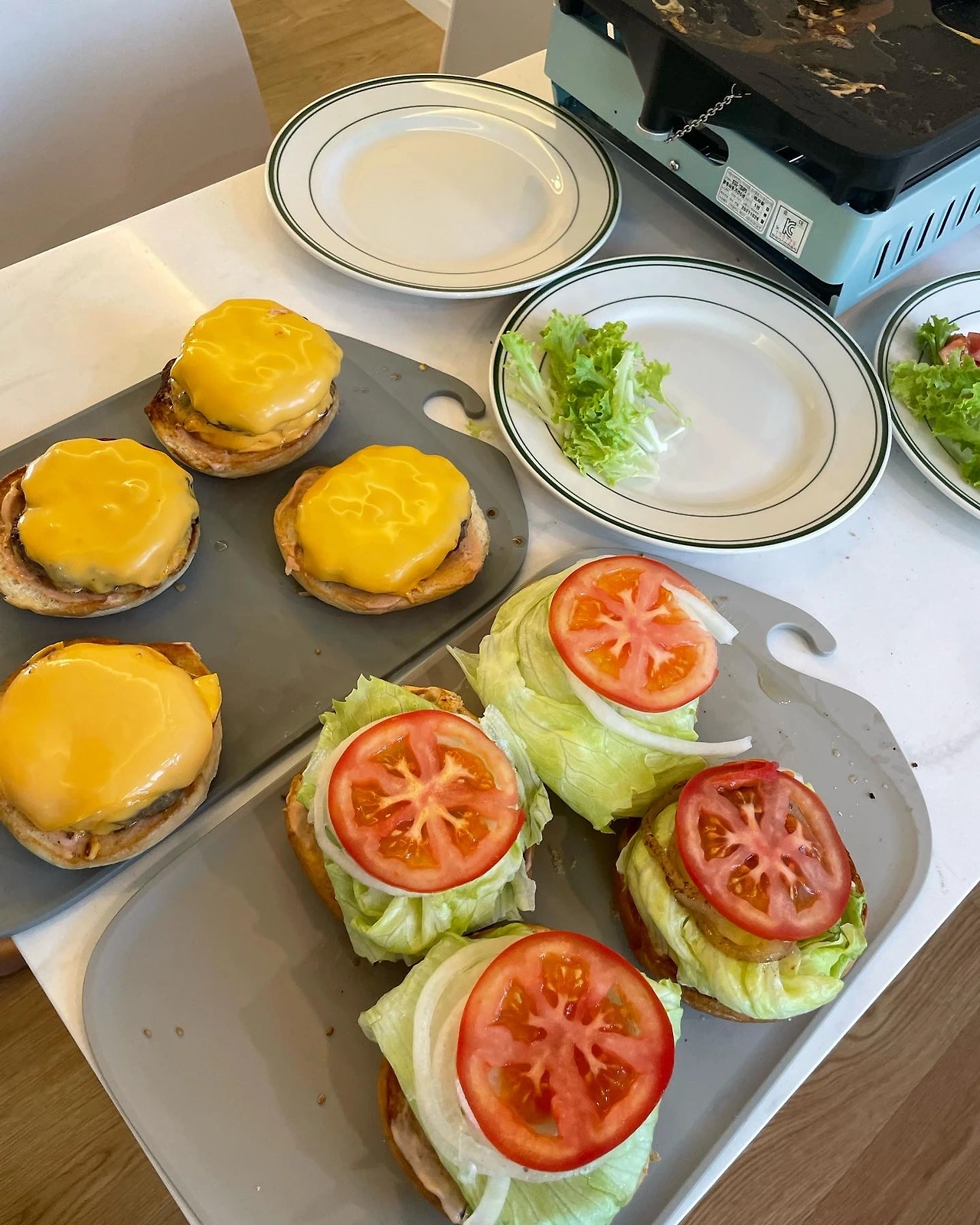 고기가 거의 다 익으면 마지막으로 치즈를 한장씩 얹고 불을 끈다. 남은 열로 자연스럽게 치즈가 녹을 수 있도록. 그리고 이제 조립만 하면 된다.