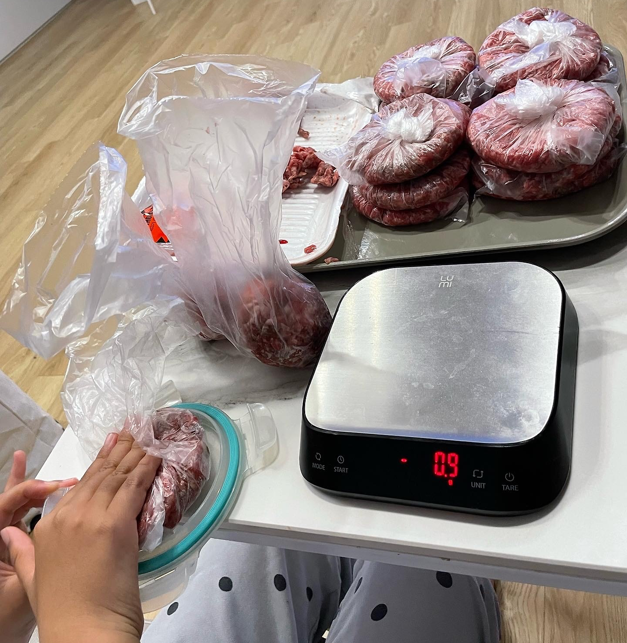 힘들게 반죽 할 필요가 전혀 없다. 그저 다짐육을 동글납작한 모양으로 소분하면 된다. 치대면 오히려 더 질겨지니 그냥 비닐에 넣기만 하는거다. 랩을 잘라 쓰기도 번거로우니 작은 위생백 하나에 하나씩 넣으면 딱 좋다. 내가 뚝뚝 떼서 동그란 공처럼 만들어 놓으면 옆에서 둘째군이 뚜껑을 이용해 납작하게 눌러놓는 작업을 한다.