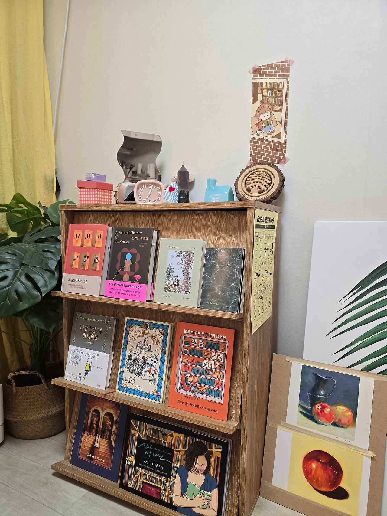 그렇다면 우리의 '거실 책방'의 현실을 어떨까? 처음에는 소파에 앉아 노오란 조명을 켜고 책을 읽기만 해도 행복했던 시절이 있었다. 그러나 퇴근하고 피곤해서 집에서는 무조건 방 침대에 눕기 바쁜 일상이 대부분이 되었다. 게다가 나는 책 욕심은 많지만 사실 집이 작아 책을 놓을 공간에 대한 부담감 때문에 원하는 대로 사서 꽂아둘 수가 없었다. 그래서 내 욕심에 부합하는 책방 같은 곳을 만들기에는 우리 집이 터무니없이 부족하다는 생각을 하기도 했다.