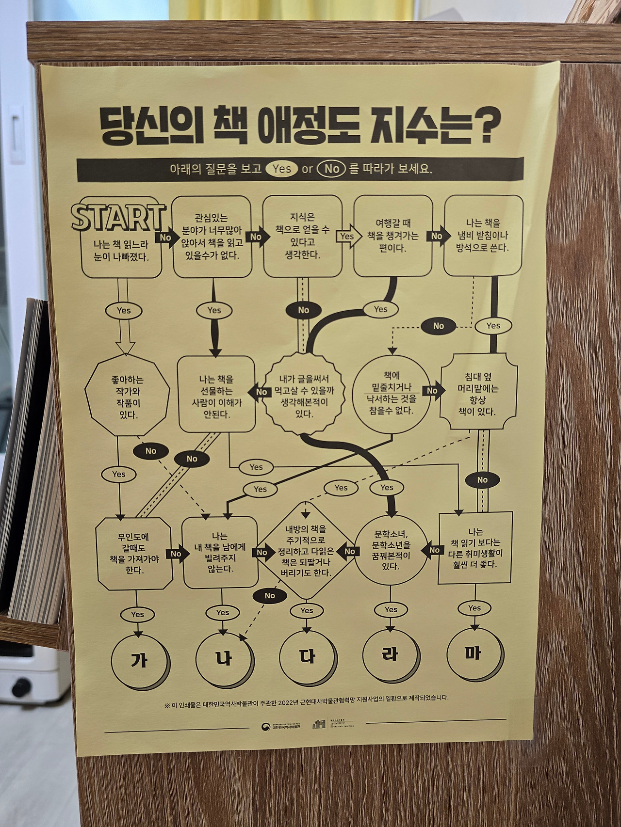 이전에 춘천 여행을 하다가 책덕후로서 꼭 갈 수밖에 없었던 박물관이 있었다. 바로 '책과 인쇄 박물관'. 그곳에서 아주 재미난 포스터를 받아 왔는데, 바로 사진에 보이는 <책 애정도 지수> 테스트이다. 시작하자마자 절벽에서 떨어지듯 초고속으로 'YES'를 지나쳐 첫 번째 유형인 '가'에 꽂혀버린 내가 너무 웃겼다. 바로, 책 중독자란다.