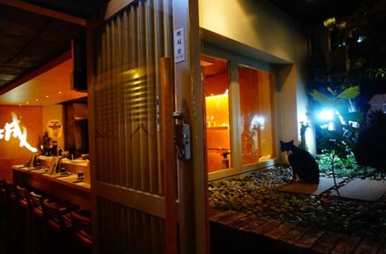 검은 길고양이는 조리사의 칼끝에서 눈을 떼지 않는다.