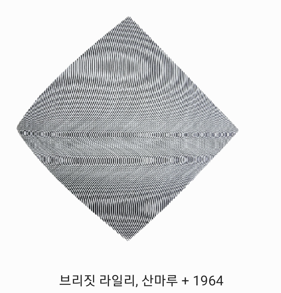 그림은 바라보거나 안을 들여다보아야 하는 그림이라기보다 보는 사람에게 어떤 작용을 하는 작품이었다. 예를 들어 산마루 (1964) 앞에 서면 세계가 진동하기 시작한다. 대개 정적이고 안정적일 거라고 예상하는, 가녀린 선으로 덮인 패널에 파동이 일어나고 요동이 친다. 라일리가 실제로 사용한 흑백률 외에 희미하게 빛나는 분홍색과 청록색, 녹색 등 다른 색이나 나타났다 사라진다.