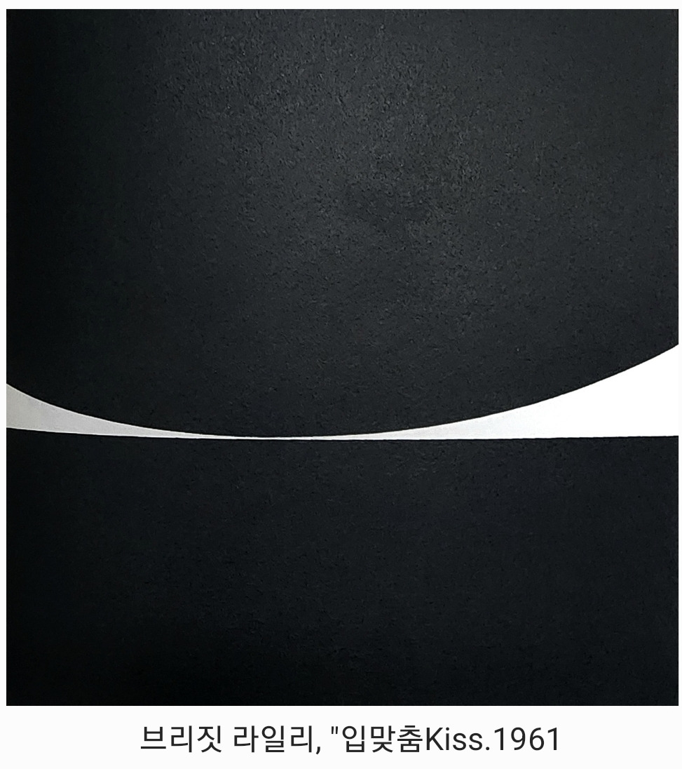 명쾌한, 곧 분명한 사고와 논리적인 구조가 라일리의 깊은 관심을 끈 것은 분명했다. 그러나 라일리의 작품에서는 이 세심한 분석만큼이나 감정의 소용돌이도 중요했다. 비단 연애뿐 아니라 20세기 미술과의 새로운 대결, 그리고 20세기 미술에 그녀가 무엇을 어떻게 추가할 수 있는지, 이 모든 일에서 끝나 버린 것 같은 느낌이었다. 그래서 그녀는 마지막 그림, 오로지 검은색만을 사용하여 애도하는 캔버스를 그리기로 결심했다. 작품을 완성했을 때'작은 목소리가 그 작품이 아무런 영향을 미치지 못한다고 속삭였다.'그 작품은 아무것도 표현하지 않았으며 대조도 없었다. 그래서 다음 작품에서 그녀는 두 형태의 만남, 또는 헤어짐을 나타내는 흰색 부분을 추가했다. 위쪽 형태는 신체의 윤곽선처럼 아랫부분이 완만한 곡선을 그리며, 아래쪽은 직사각형을 이룬다 이두 형태는 가깝게 당을 듯하지만 만나지는 않는다. 두 형태를 가르며 중간에 자리 잡은 흰색 영역의 가늘고 미세한 공간이 전체 화면에 긴장감을 자아낸다. 라일리는 작품 제목을 입맞춤.(1961)으로 정했다. 이 작품은 그녀에게 한증 신화 된 가능성을 제시해 추는 것처럼 보였다. 그녀는 자기 자신에게 "좋아. 한 장만 디 그리 보자."라고 말하고는 작업을 시작했다.