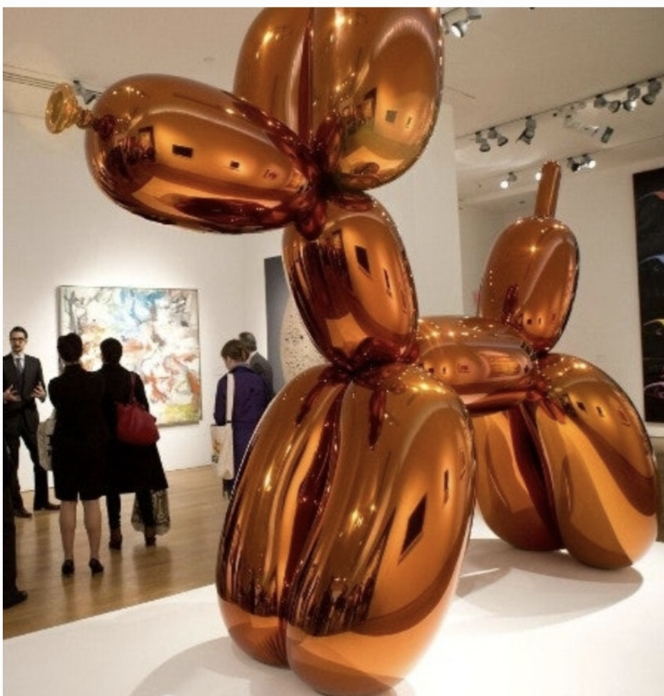우선은 제프 쿤스의 <벌룬 독> (1994~200). 트위스트 벌문, 즐길 속한 풍선을 비틀어 만든 개 모양의 조각 시리즈로, 거울처럼 반짝이는 스테인리스 스틸 위에 반투명으로 컬러 코팅을 한 것이다. 높이는 3m 이상. 시리즈 중 하나인 벌룬 독:오렌지는 2013년 11월의 뉴욕 크리 스티 경매에서 5,840만 달러(약 680억 원)에 낙찰돼, 당시 생존 작가 사상 최고가를 기록하며 화제가 되었다.