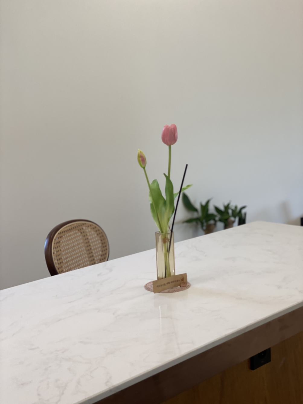 단조로운 테이블에 튤립의 존재만으로도 공간을 환하게 만드는 효과가 있습니다.