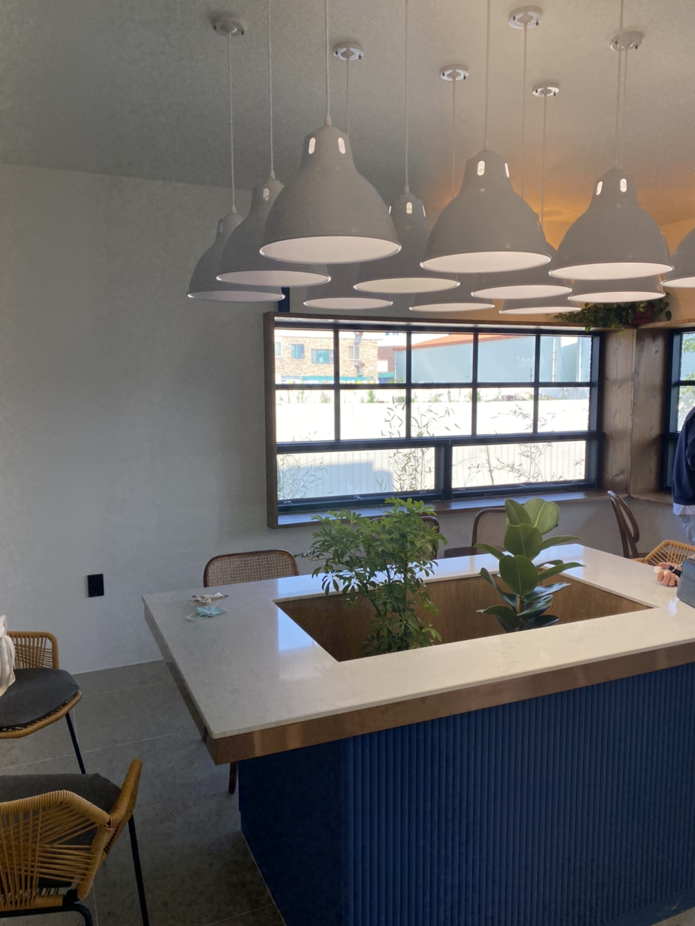 카페의 메인이 되는 공간에는 큰 테이블과 멋진 조명, 그리고 그 중앙을 홍콩야자와 고무나무가 포인트를 주고 있습니다.