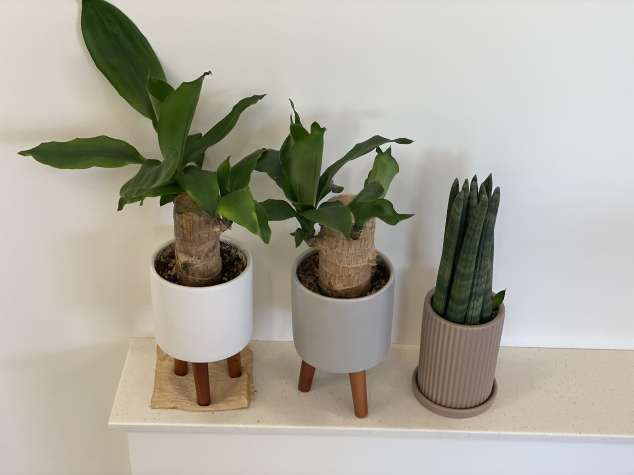 귀여운 화분에서 함께 자라고 있는 행운목들