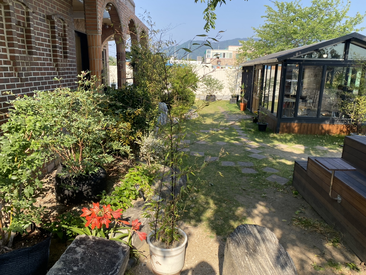 카페 메인 건물 정원에도 여러 식물들이 조화롭게 자리하고 있었습니다. 멀리서 보면 그저 초록색 식물들이 모여있는 것 같지만 자세히 보면 저마다의 매력을 지니고 있습니다.
