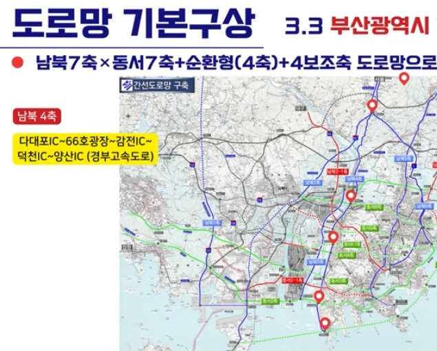 격자형 구조의 형태로 구축되어 있고 부산의 개발 방향에 따라 도로를 신설, 연장하고 있다는 것을 설명하고 있다.
