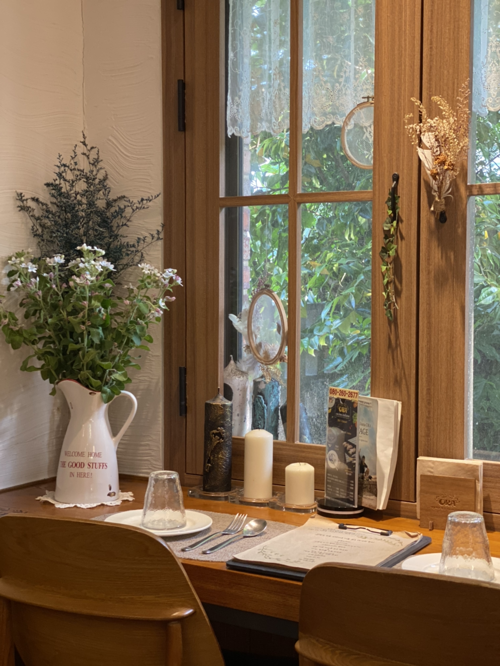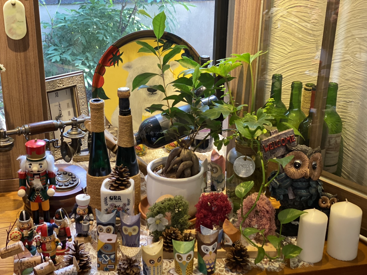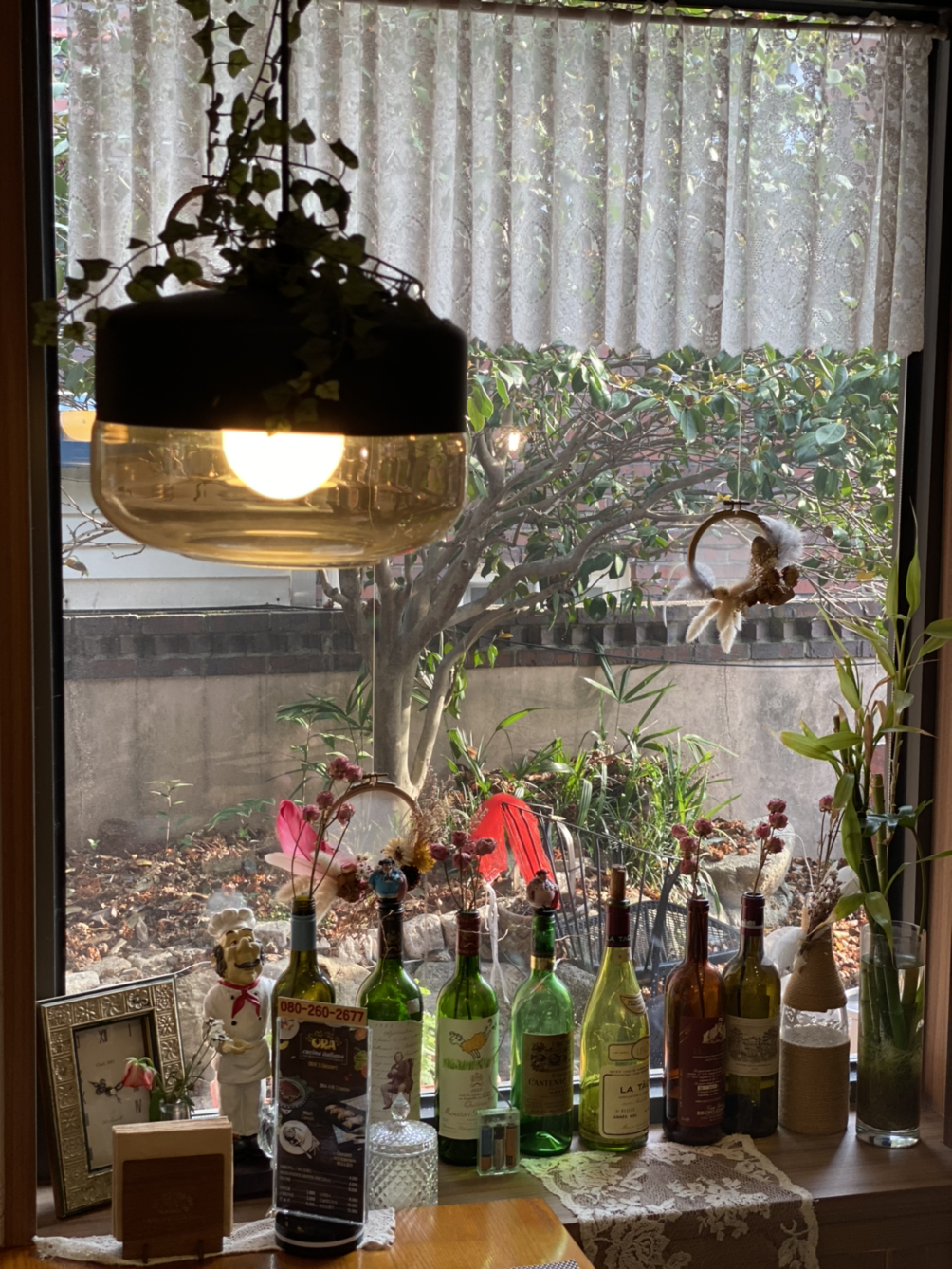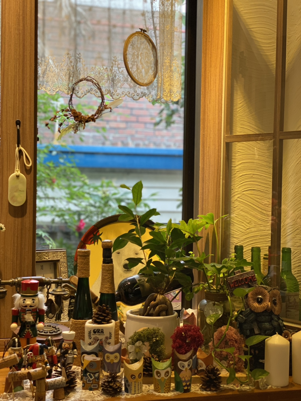 창가 자리에는 다양한 장식품들과 각종 병, 식물들로 예쁘게 구며진 공간이 있었습니다.