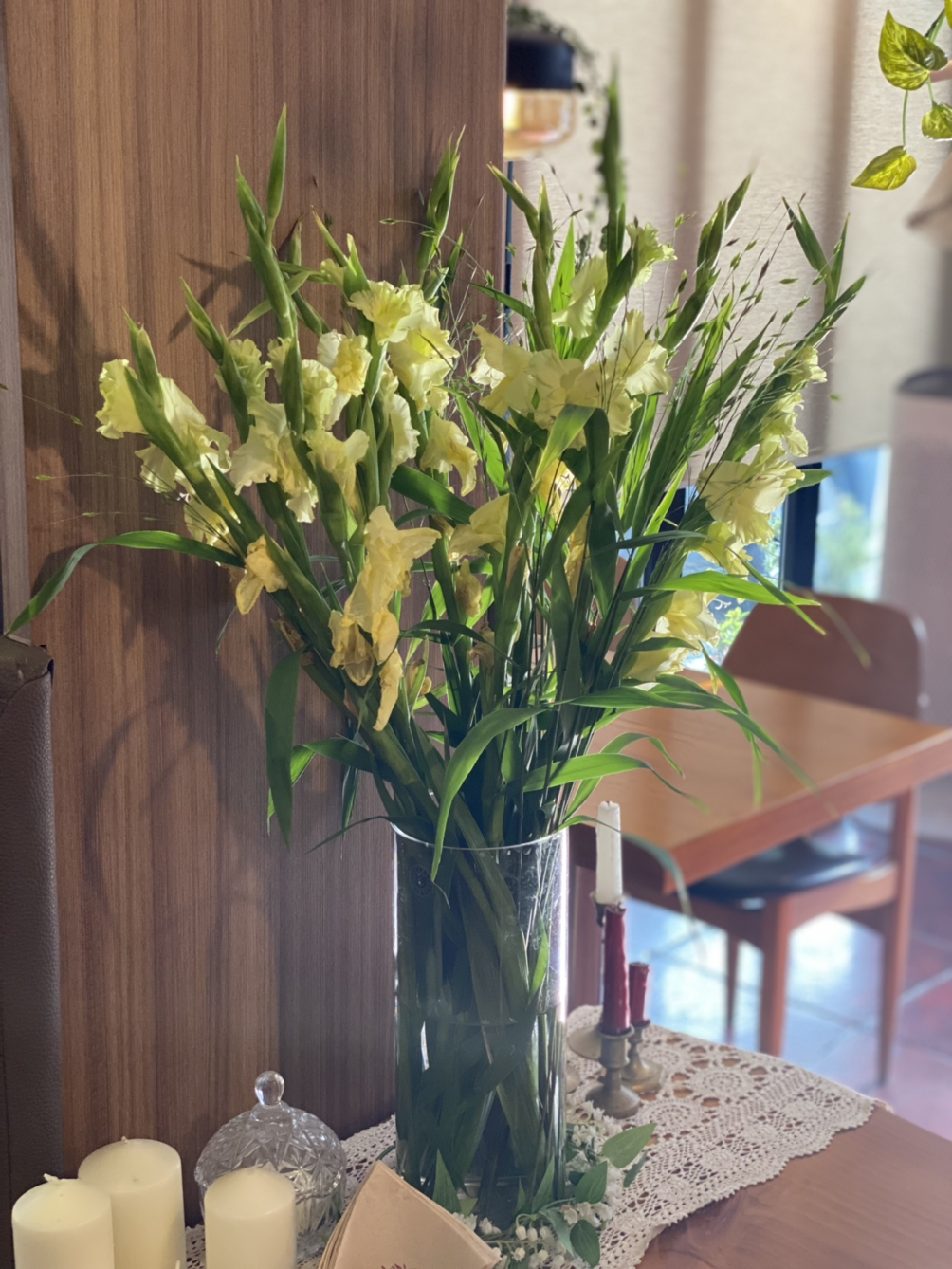 다른 공간에는 글라디올러스가 우아함을 더하고 있었습니다.