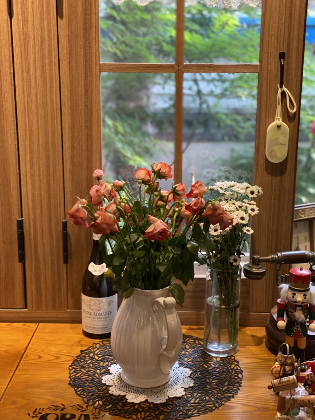 와인병에서 쉬고 있는 꽃들이 손님들을 반기는듯 합니다.