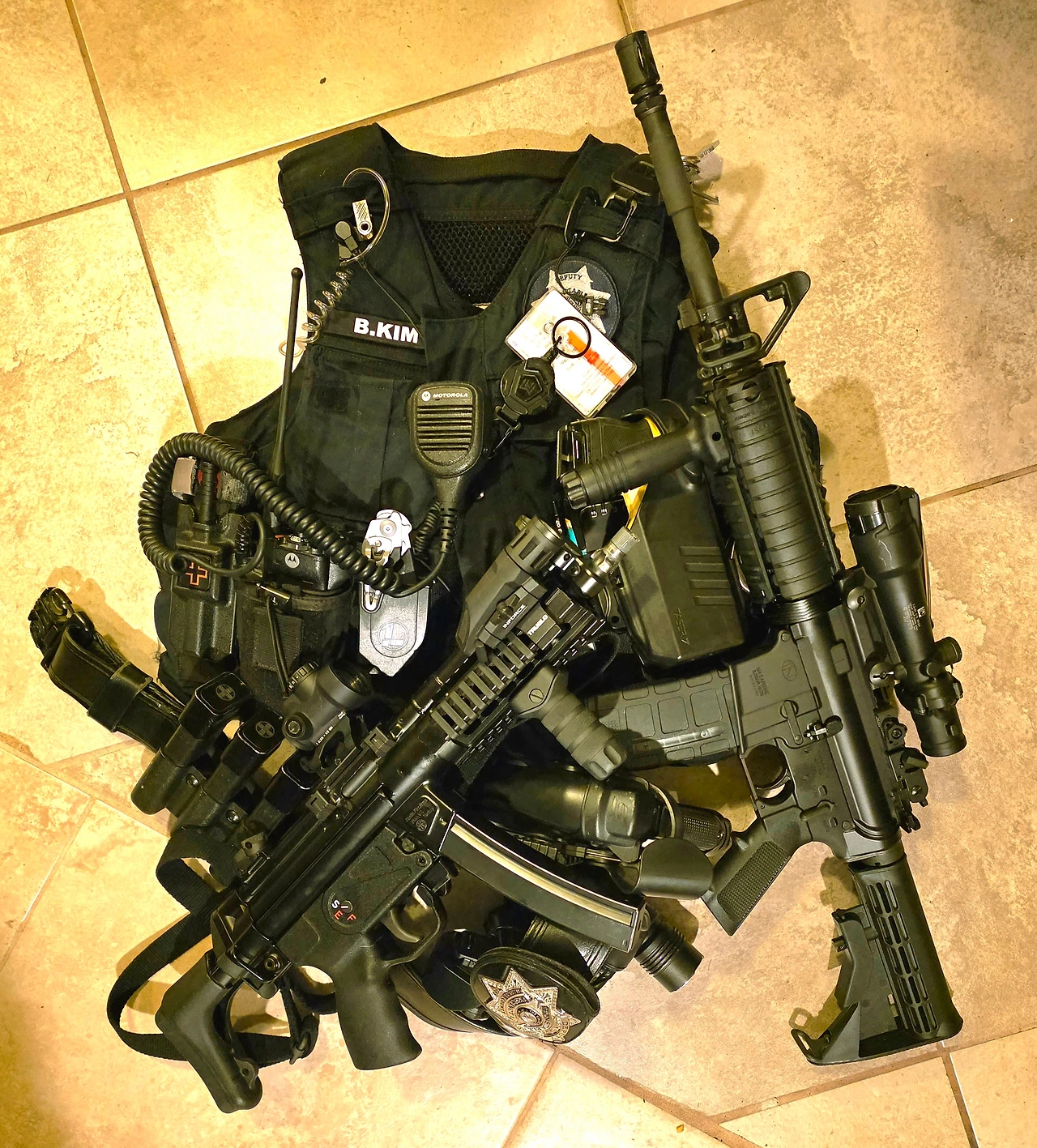 허리에 걸친 것들—벨트, 홀스터, 탄창 파우치, 무전기, 온갖 장비가