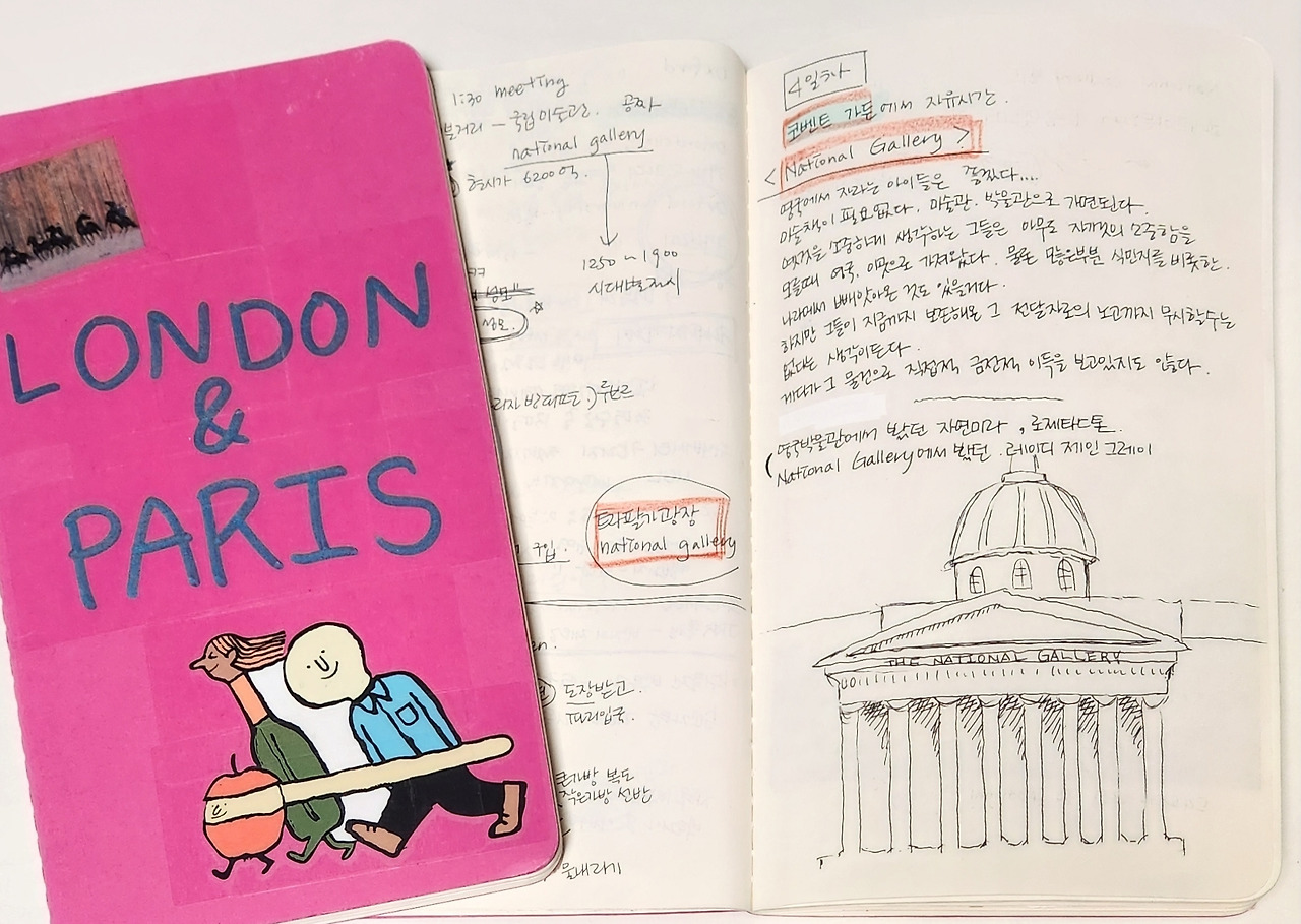 여행의 준비물에서부터 스케줄이나 비행시각, 필요한 정보를 담아가고 여행 중의 과정, 어디에서든 받은 느낌을 자리만 앉으면 끄적인다. 시간이 허락되는 곳에서는 풍경이나 랜드마크가되는 건물등을 노트에 스케치해보기도 한다. 여행의 낯섬과 낯선곳에서의 불안, 생각, 느낌을 모두 그곳에 담고 돌아온다. 보통 노트 앞면에는 여행간 도시명이 적고 그게바로 그 여행기의 제목이 된다. 이번 딸과 다녀온 유럽여행에 몰스킨 실제본노트 핑크색을 구입해서 호기롭게 '런던 파리'라는 제목만 달랑 적어 여행 내내 기록 해봤다. 9일간의 여행을 마치고 다 적을 수 없었던 페이지에는 사진을 출력해서 붙이기도하고 여행 중 구입했던 영수증을 추억으로 붙였다. 표지 제목 밑에는 가장 즐거웠던 딸과의 베르사유궁전 점프샷 사진을 붙였다. 몰스킨, 안그래도 비싼 노트가 이제 내게는 값을 메길 수없을 만큼 소중해졌다.