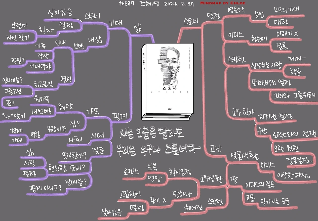 단순히 캐릭터가 이상해서 그랬던 것은 아니다. 딸하나 둔 가정에 바쁜 아빠를 가진 우리 집이 스토너의 가족과 비슷해 보였다. 그래서 스토너를 힘들게 하는 이디스를 보면서 내가 그녀 같지는 않았는지 자꾸만 돌아보게 되었다. 무엇하나라도 비슷하면 인정하고 싶지 않을 것 같았다. 들춰보고 싶지 않은데 자꾸만 마음이 쓰였다. 내 안에 이디스가 없다고 말하기 힘들었다. 속으로 생각만 했던 이기적이고 내 안의 사악함을 그녀가 보고 있는 것 같았다. '너도 지?'