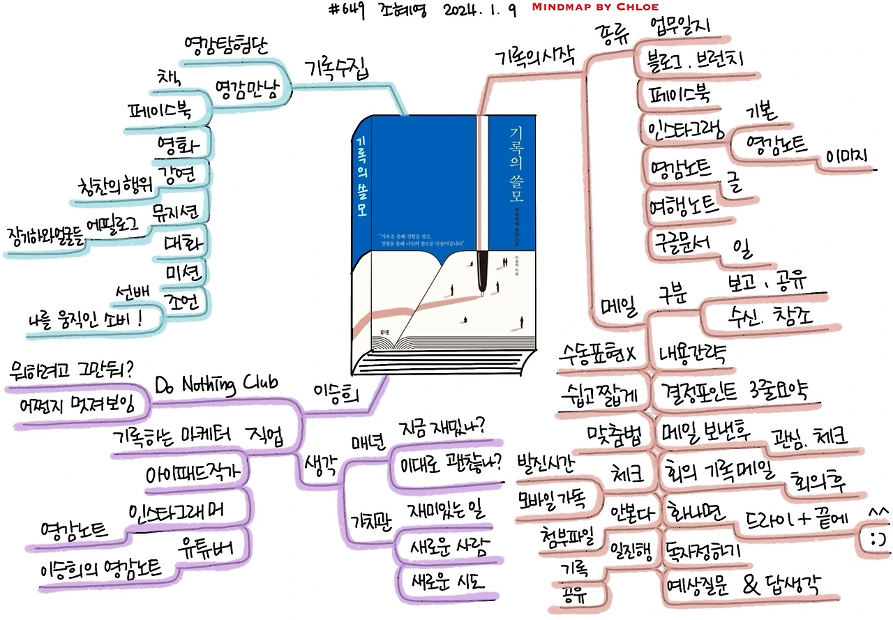 이 책은 마치 다른 사람의 노트를 훔쳐보는 느낌이 난다. 대단한 기록의 비법이 담겨있지 않지만 펼치고 계속 보게 되는 책이다. 업무시간에 일과 태도에 대한 조언으로 한마디, 상사의 피드백과 저자가 후배에게 준 피드백뿐만 아니라 우리가 늘 보내는 시간, 그렇지만 누적되지 못해 보이는 SNS에서 받은 영감도 하나의 페이지가 되어 사유와 함께 책이 되었다. 페이스북의 영감, 영화, 강의, 뮤직 앨범 에필로그에 적힌 글에서도 영감을 받아 자신의 생각을 적어 책으로 만들었다. 또 이메일을 대하는 자세에는 숙연해지기까지 했다. 내 일은 메일로 의견과 자료를 받는 일이 아니라 몰랐는데 다른 직업을 가진 사람들은 이렇게 이메일이도 체계와 정성과 루틴이 있다는 사실이 놀라웠다. 이 책을 보면서 그녀의 노트가 너무 탐났다. 손에 들어올만한 포켓용 실제 본 노트를 프리이탁 커버에 싸서 펜과 함께 주머니에 푹 찔러 넣고 앉을 자리만 생기면 지하철이든 음식점이든 끄적이고 있을 그녀가 떠올랐다. 그녀가 받은 영감 중 내가 받은 최고의 영감 하나!