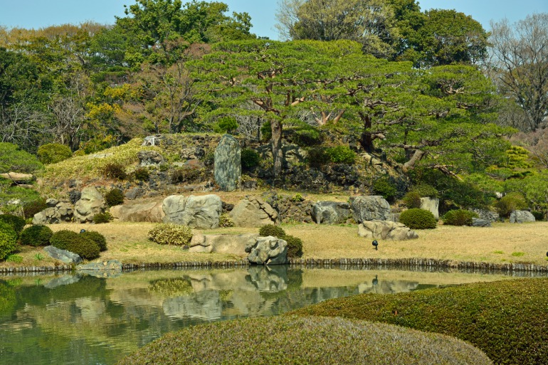 리쿠기엔의 해질 녘, 폐원 시간이 다가오자 아쉬움에 이끌려 다시 한 번 정원을 뒤돌아본다. 연못 한가운데 고요히 떠 있는 섬 나카지마(中島), 그리고 그 위에 나란히 솟은 두 봉우리 이모야마(妹山)와 세야마(背山)가 발걸음을 붙잡는다. 남과 여를 상징한다는 이 두 형상은 다산과 번영이라는 오래된 소망을 품고 있다. 그러나 두 봉우리는 가까이 있으면서도 끝내 닿지 않는, 미묘한 간극을 사이에 두고 서 있다. 그리고 바로 그 틈에서, 나는 오래된 신화 하나를 떠올린다.