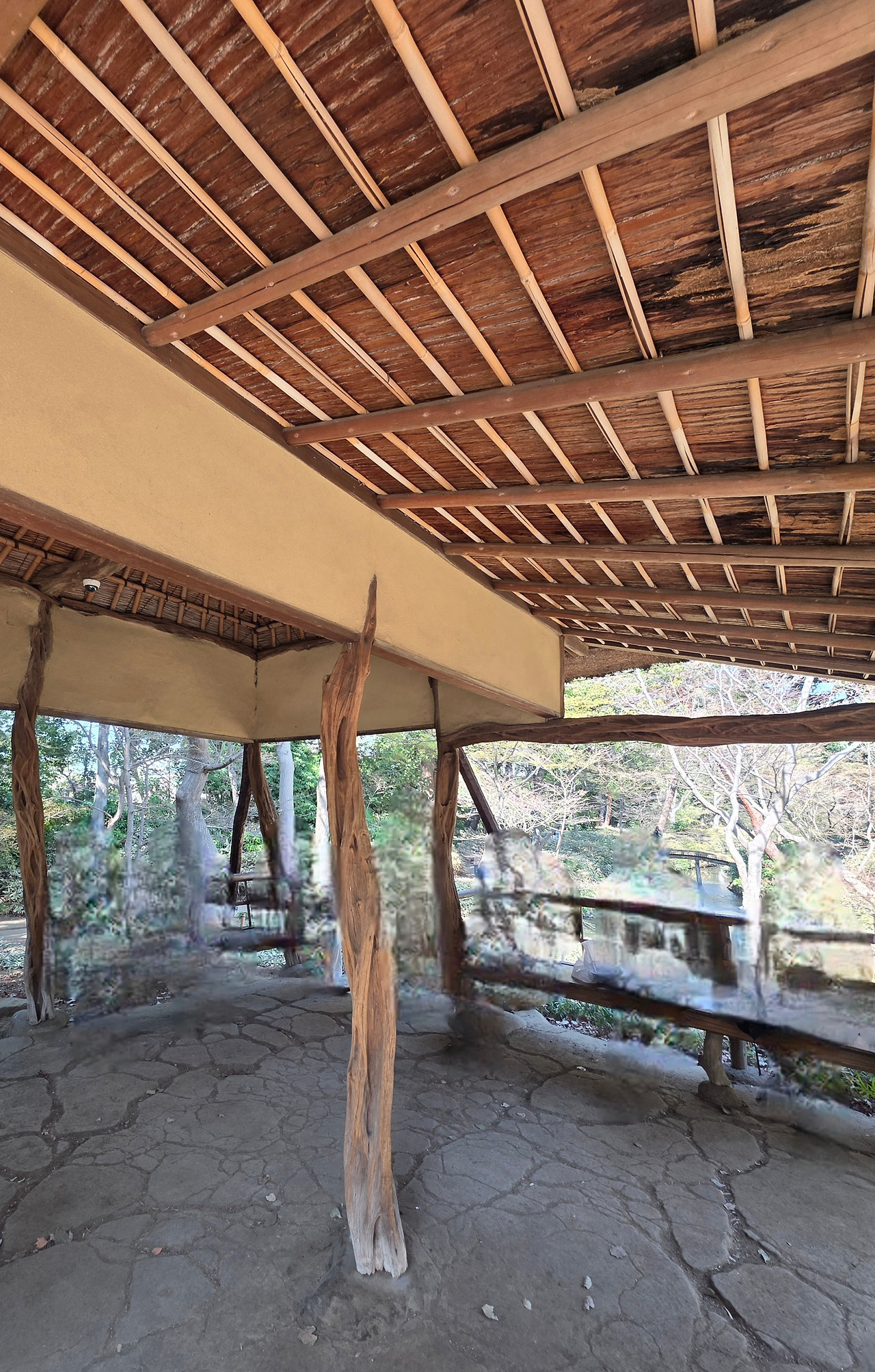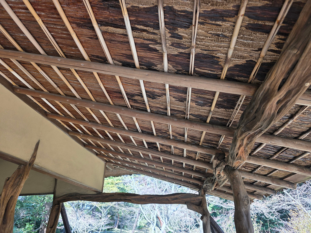 단풍나무들이 아직 잎을 틔우지 못한 채 빈 가지로 하늘을 그리는 언덕길. 그 길 끝에 정자는 마치 본래부터 그 자리에 있던 고목처럼 고요히 앉아 있다. 지붕은 억새와 짚을 겹겹이 얹어 거칠고 투박하다. 훗날 가을이 깊어지면 불타오를 단풍잎들이 이 지붕 위를 수놓겠지만, 지금은 그저 숲의 앙상한 실루엣을 묵묵히 받아내고 있을 뿐이다.