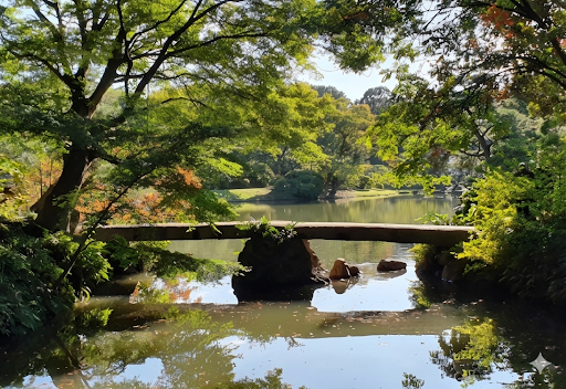 도게쓰쿄는 우리가 흔히 일본의 전통적 정원에서 떠올리는 화려한 아치형 곡선의 다리가 아니다. 대신 거대한 자연석 두 장을 툭툭 이어 붙인 듯한, 무심하고도 투박한 돌다리가 물 위를 가로지른다. 이 다리는 인공의 꾸밈을 거부한 채 제 무게를 견디며 자리를 지키고 있다.