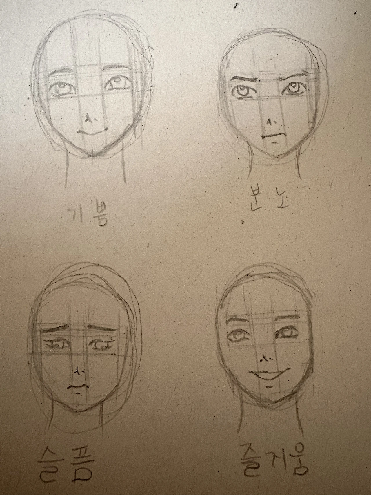 기쁨 빼고는 망한 것 같다. 나름대로 눈썹과 눈의 모양으로 감정을 표현해 보려고 노력했다. 일단 비율부터 일관되도록 연습해야 할 것 같다.