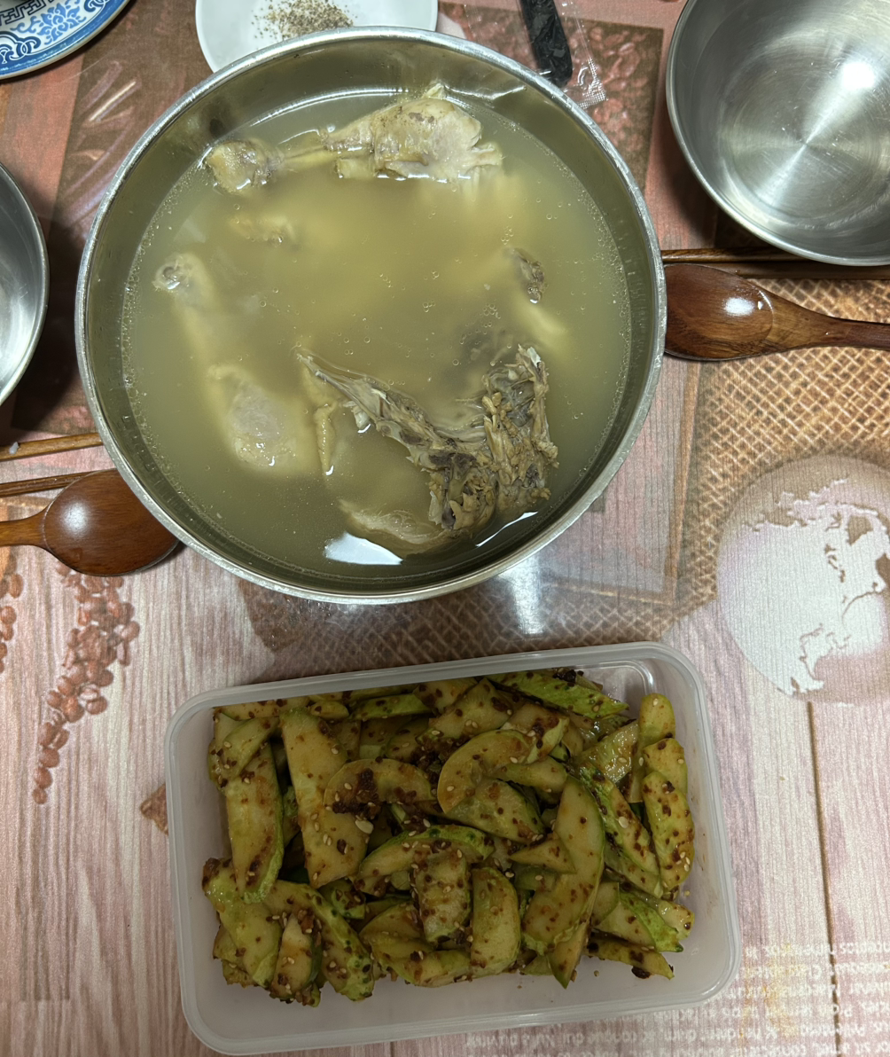 이것저것 넣고 한 시간 정도 끓이니 국물이 잘 우러난 것 같았다. 집에 있던 오이도 숭덩숭덩 썰어 처음으로 오이무침도 해보았다. 떨리는 마음으로 남편을 불렀다. 사실 남편은 나의 요리를 매우 좋아하지만 그럼에도 맛평가는 항상 떨렸다.