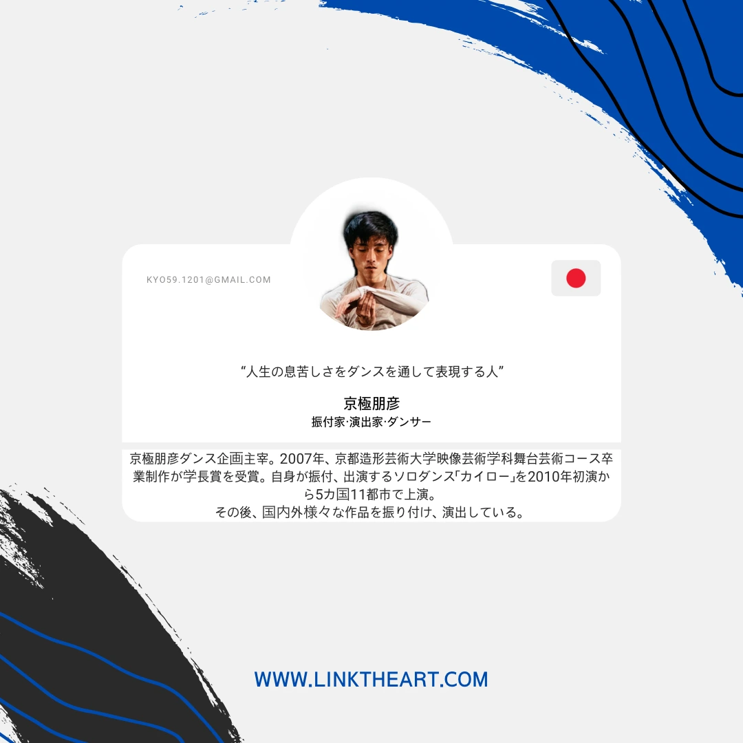 쿄고쿠 토모히코 댄스기획(京極WORKS) 대표. 2007년, 쿄토조형예술대학 영상∙무대예술학과 무대예술코스 졸업작품이 학장상을 수상. 졸업후 국내외 다양한 안무가의 작품에 출연. 솔로댄스 <카이로>(カイロー)를 2010년 초연부터 5개 국가 11도시에서 상연. 2012년부터 댄스 쇼케이스 <KYOTO DANCE CREATION>을 쿄토 아틀리에 극연의 공동주최사업으로서 3년간 프로듀스.
