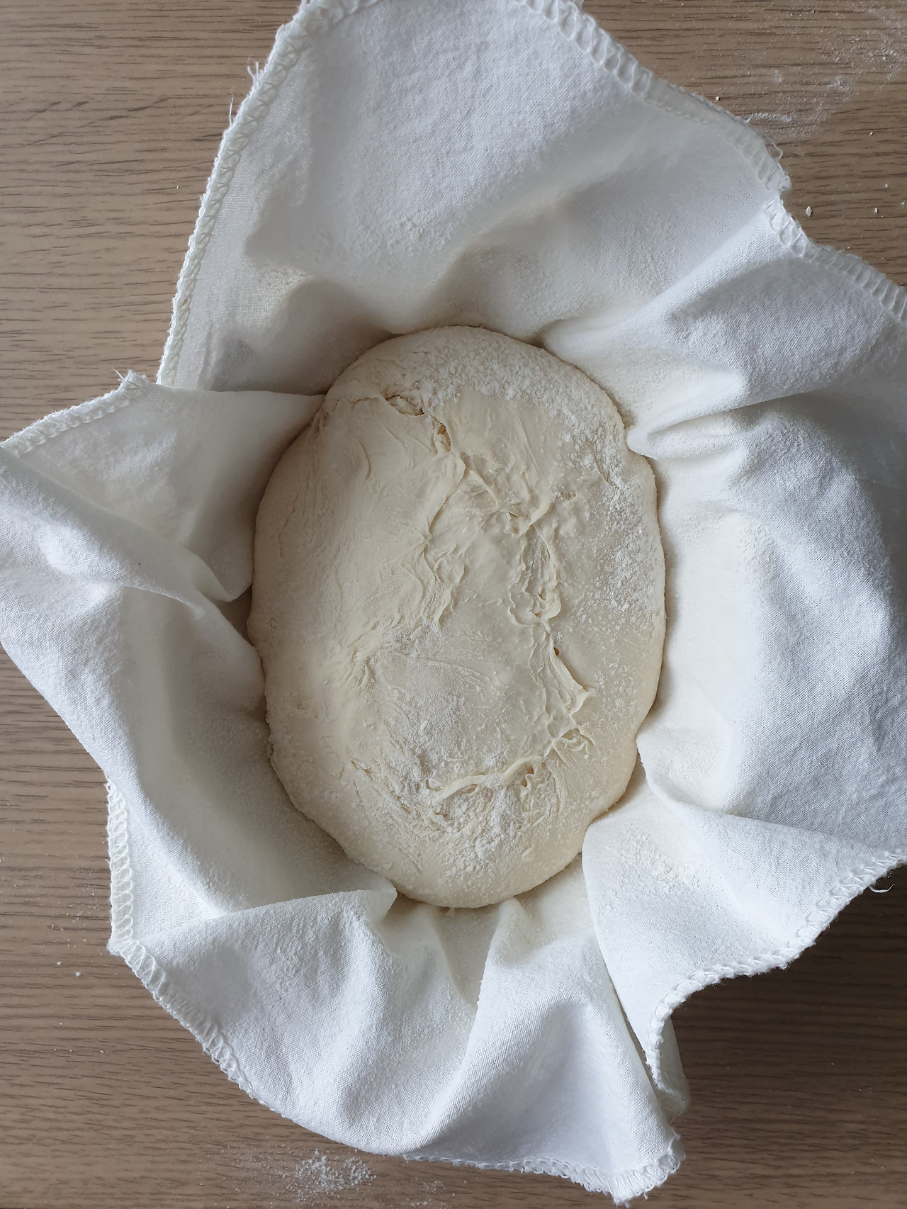 잘 꼬집어 성형하고 바구니, 면보를 깔고 덧밀가루를 뿌려서