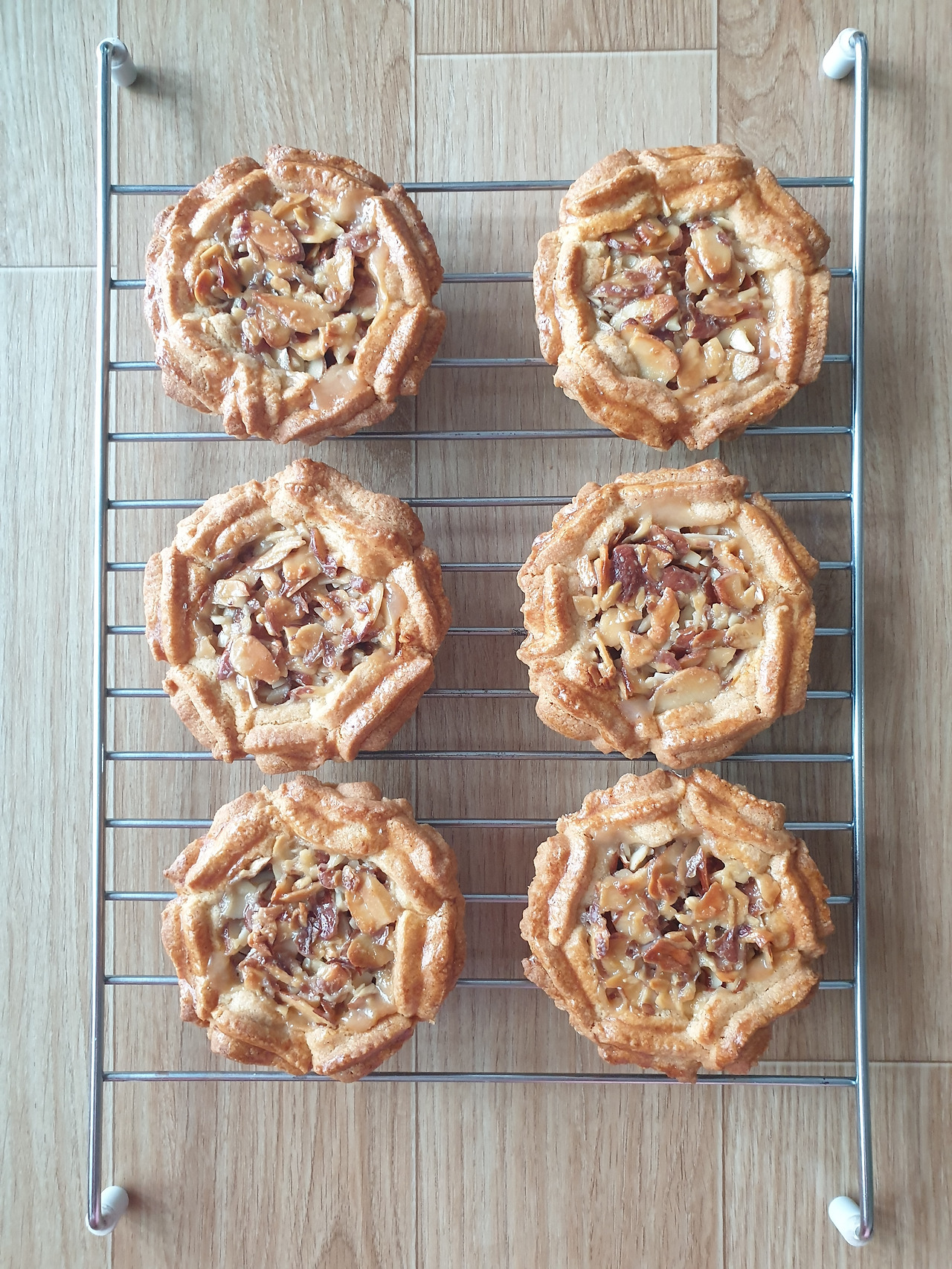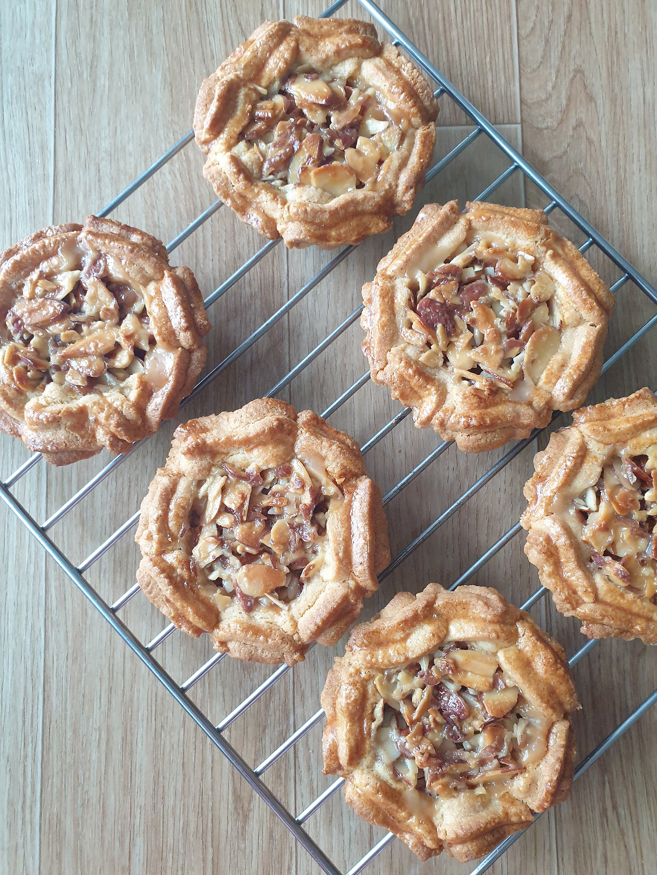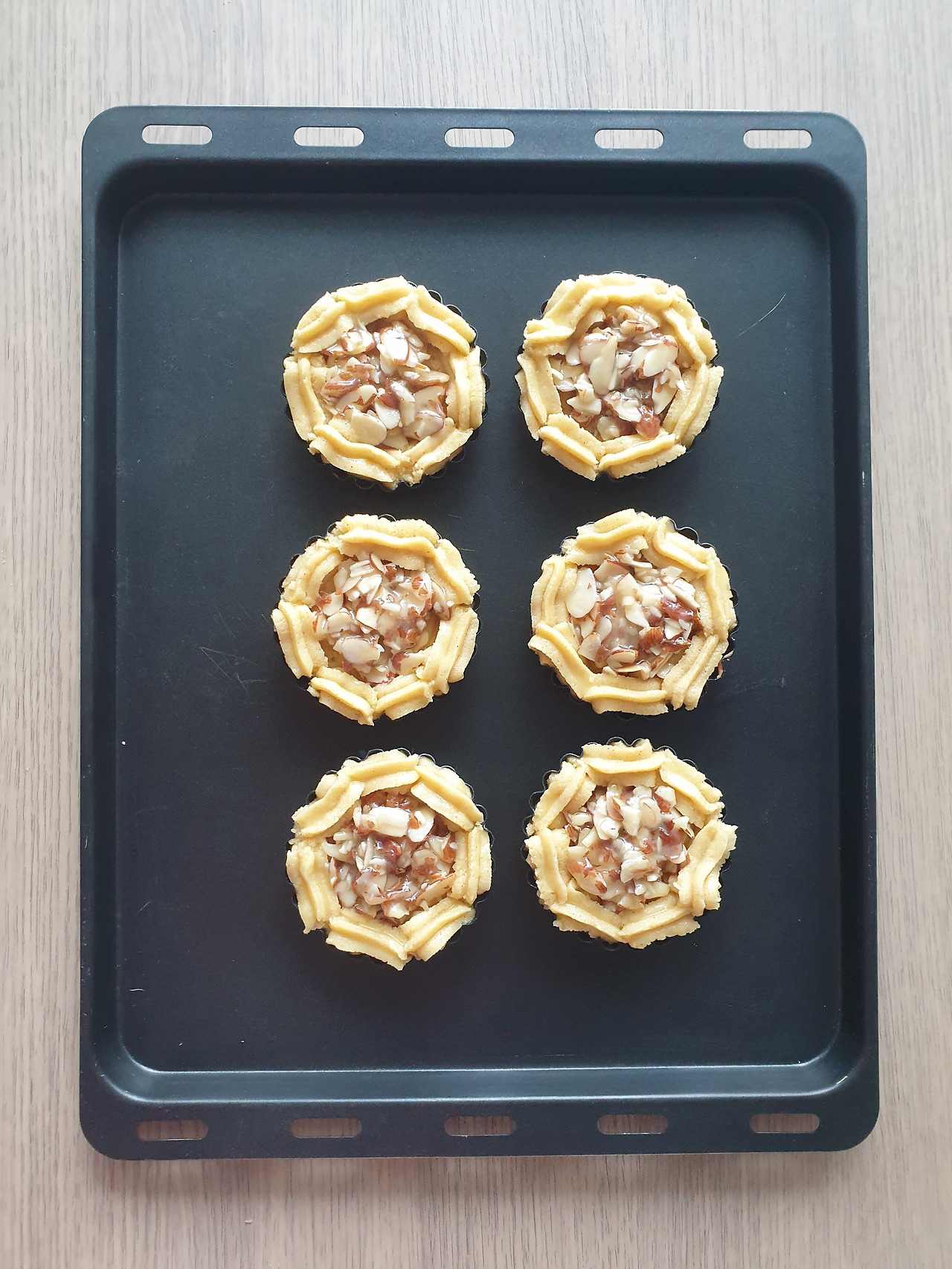 타르트지 만들어서 아몬드 캬라멜 토핑을 넣고