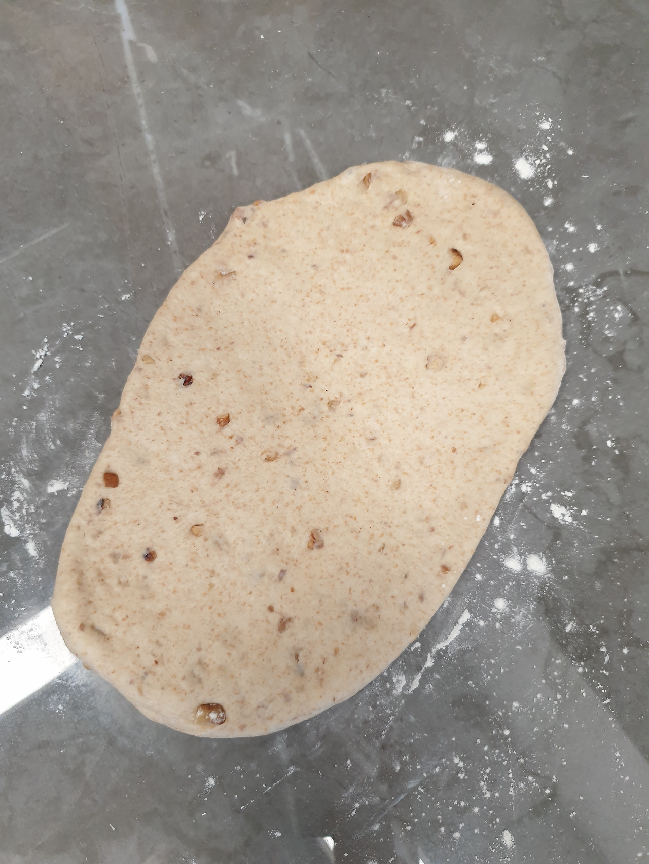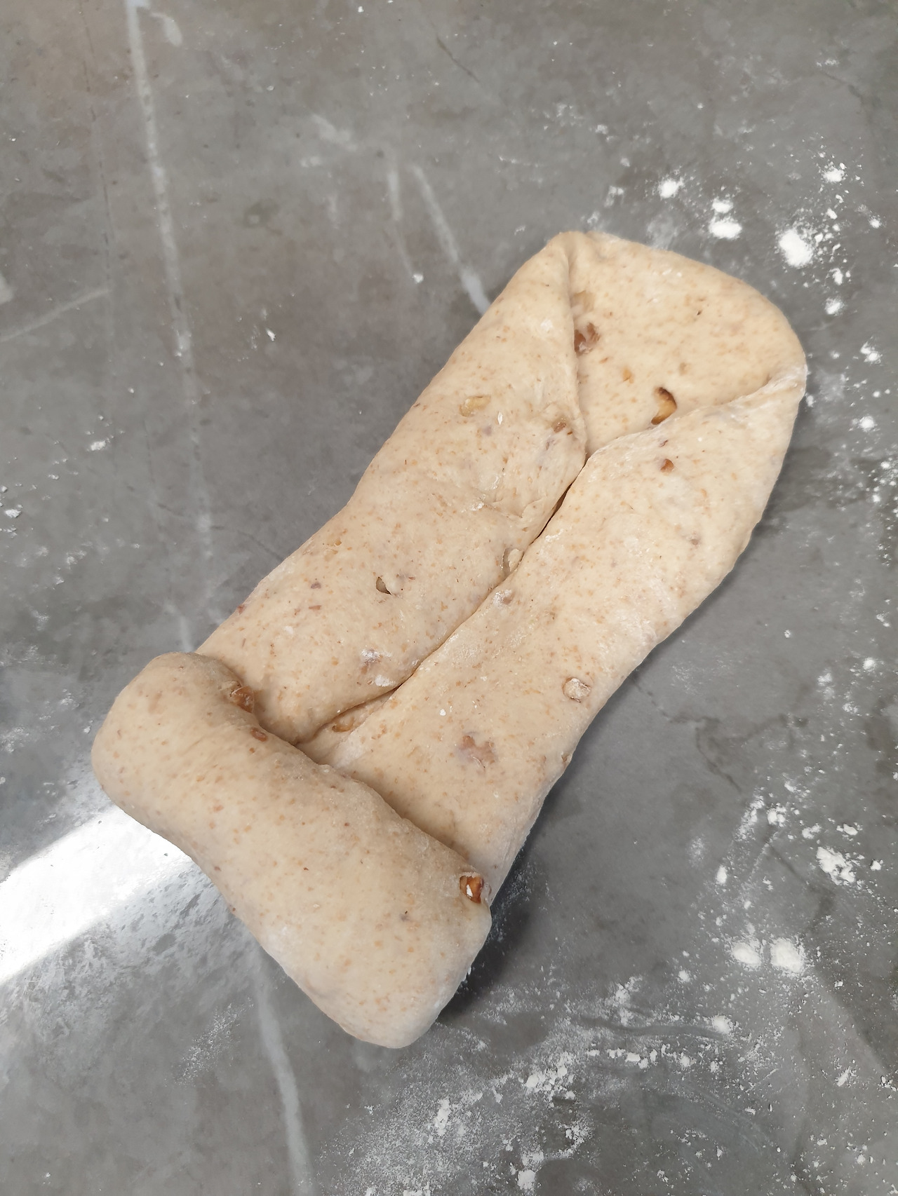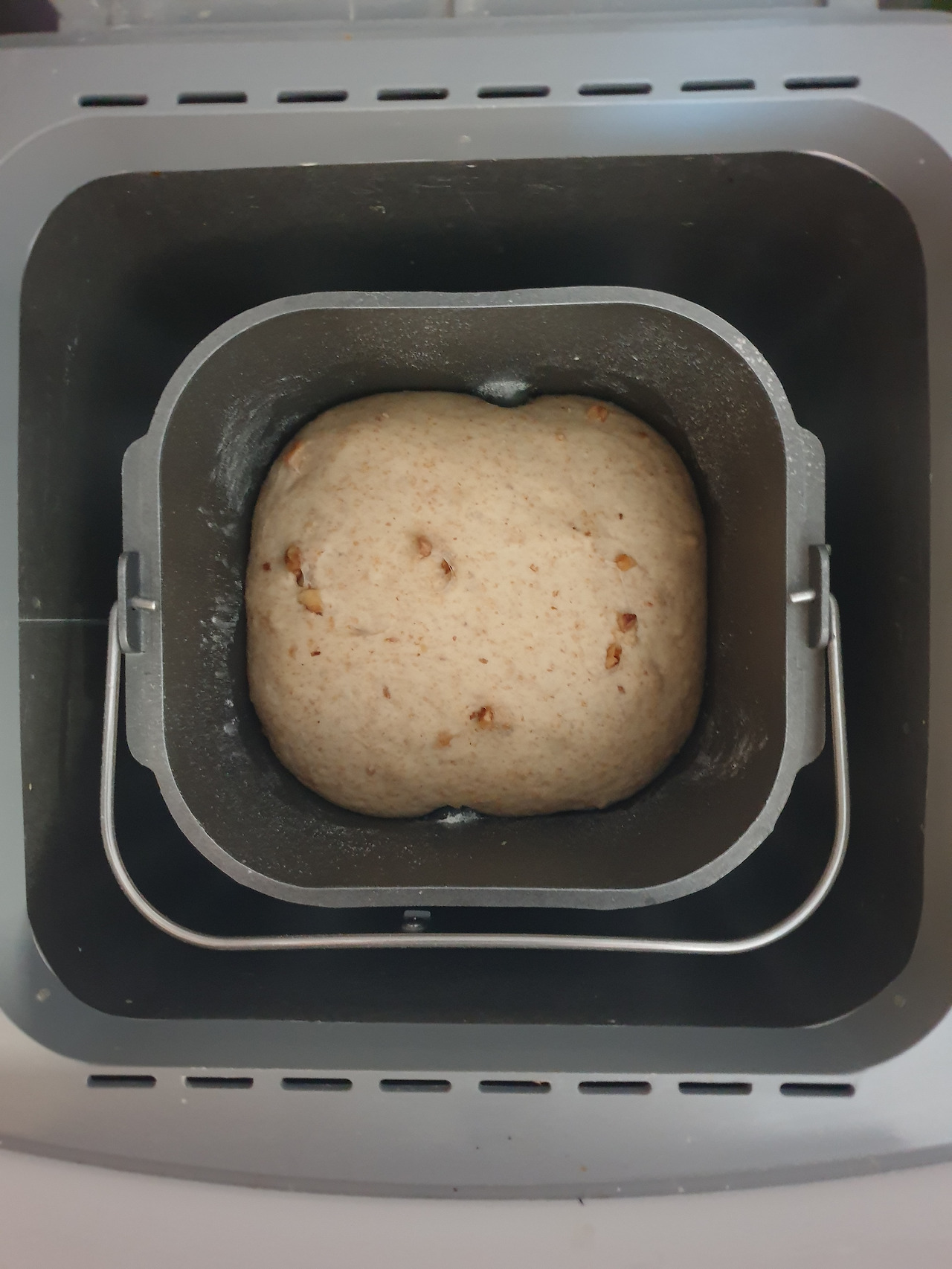 제빵기에 통밀가루, 강력분, 다진호두를 넣고 반죽 한번 돌린다.