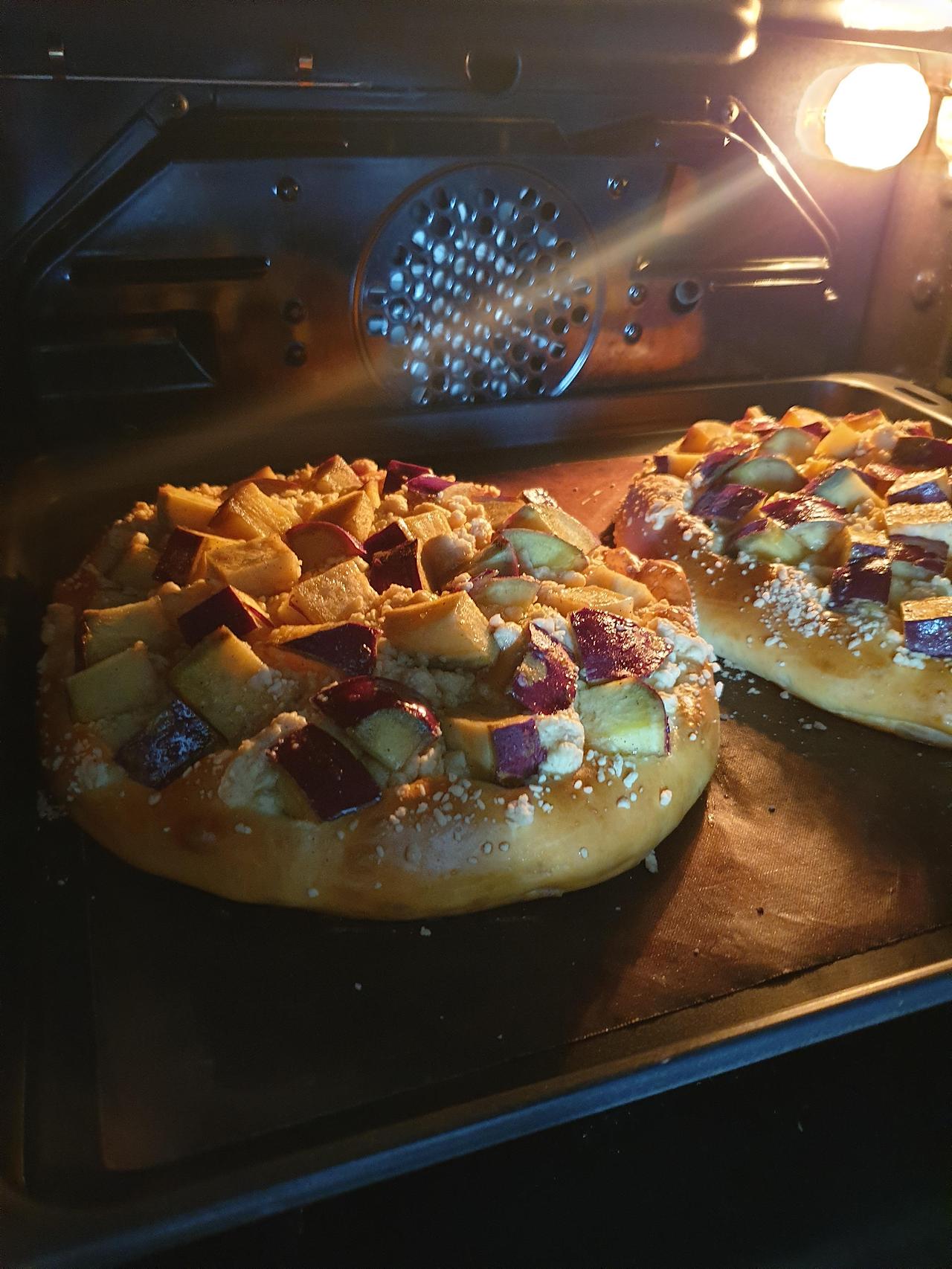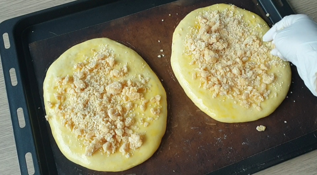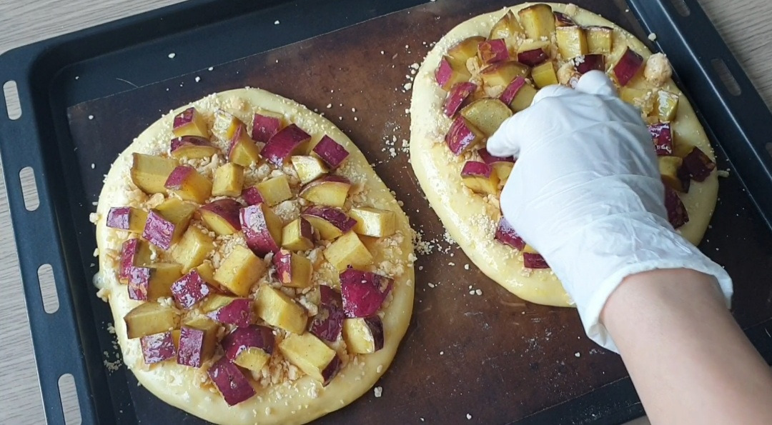 반죽을 타원형으로 펴고 오븐팬에 팬닝합니다.