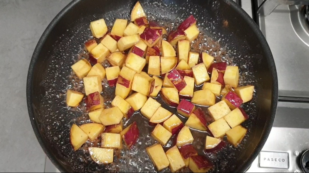 수분이 날라가면 계속 물을 추가로 넣어주면서 고구마가 투명해진다
