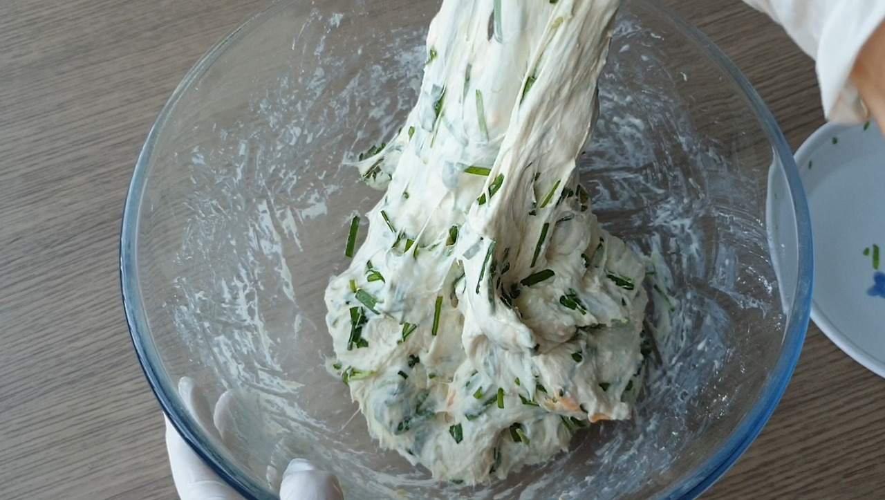 부추와, 치즈를 넣고 섞어서 20분 휴지