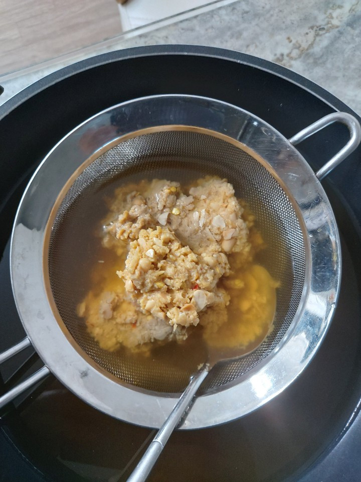 만들어 놓은 멸치 육수에 된장 3 큰술을 넣어준다. 이때 된장은 체에 걸러준다.