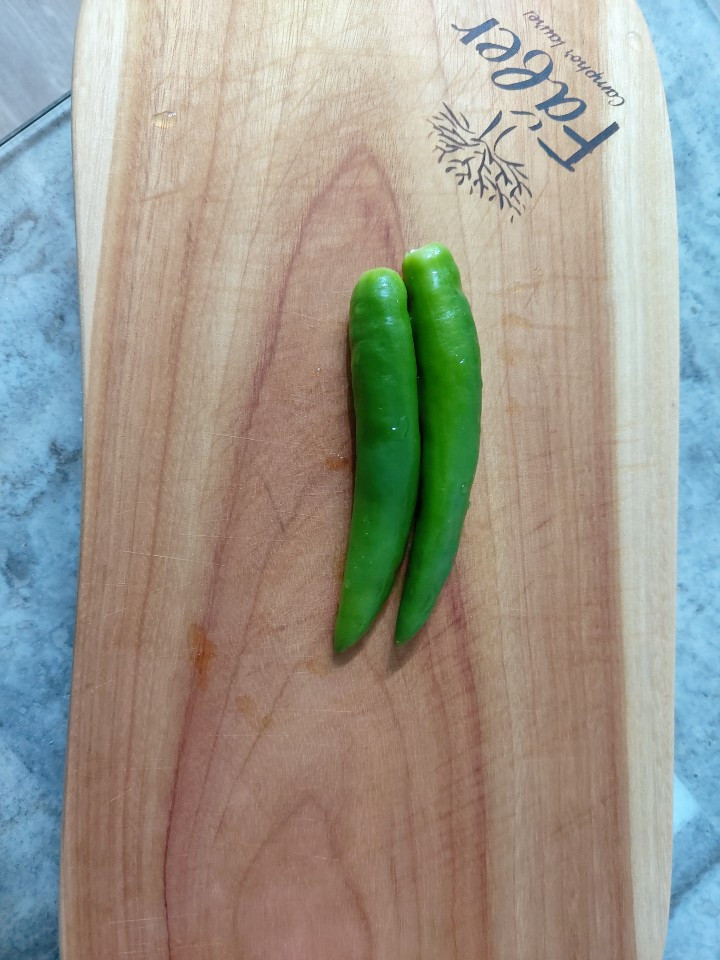 (썰린 고추 사진도 아닌, 이전 사진들처럼 숟가락 위에 재료를 올린 것도 아닌, 그냥 저렇게 도마 위에 덜렁 누워있는 생 고추 사진이라니... 그 와중에 또 사진은 정갈한 게 포인트다. 아빠는 정말 감각이 있다.)