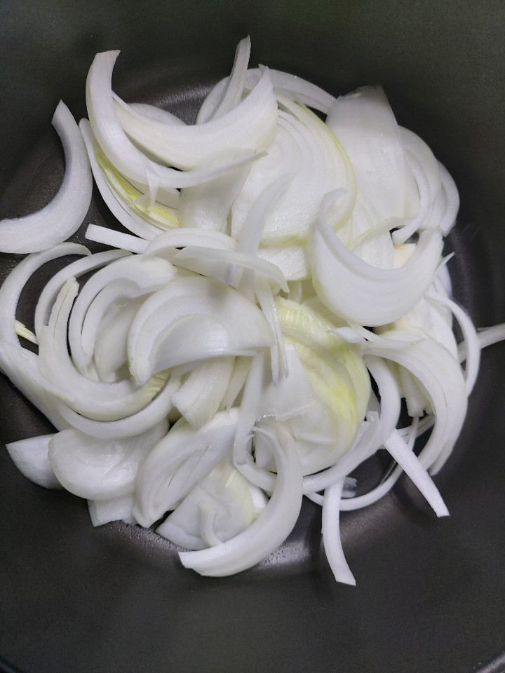 프라이팬이 충분히 달궈지면 썰어둔 양파 1개를 넣고 볶는다.