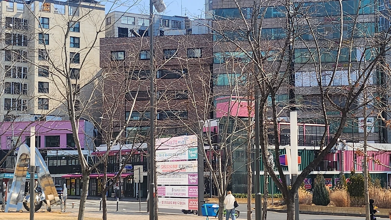 들뜬 마음을 붙잡고 천천히 걸음을 옮겨 가까이 다가가 보니, 그것은 꽃이 아니었습니다. 앙상한 나뭇가지 사이로 살짝 내비치던 것은, 수줍은 빛깔의 건물이었습니다. 연분홍 페인트로 칠해진 벽면이, 마치 꽃처럼 가지 사이에 끼어 나를 잠깐 속인 것이었습니다.
