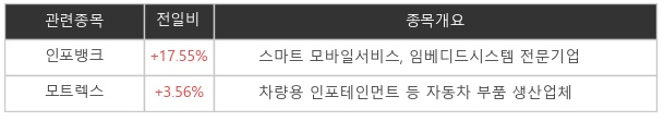 자율주행 서비스의 시범 운행이 우리 일상에 빠르게 녹아드는 이 시점에서 관련주들의 주가 상승 흐름도 두드러지고 있는데요. 로보라이드 서비스가 시행이 되던 그날, 관련주라고 일컬어지는 인포뱅크 / 대성 / 모바일 어플라이언스 등의 관련주들이 10% 이상의 상승을 보여주기도 했습니다.