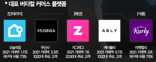 대표적으로 인테리어 플랫폼 오늘의 집, 남성 패션 전문 무신사, 여성 패션 쪽의 지그재그, 그리고 식품 카테고리의 마켓컬리 등을 예로 들 수 있겠는데요.