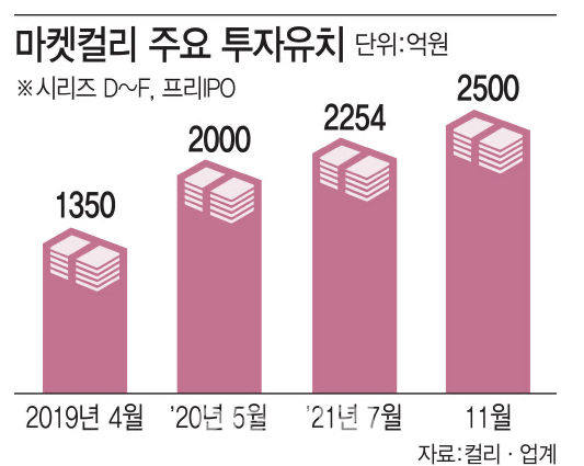 마켓컬리의 주요 투자유치 금액을 살펴보도록 할까요? 2019년 4월 1350억 투자 유치에 이어 2020년에도 2000억 2021년 7월에 2254억 그리고 같은 해 11월에 2500억을 추가 유치했습니다.