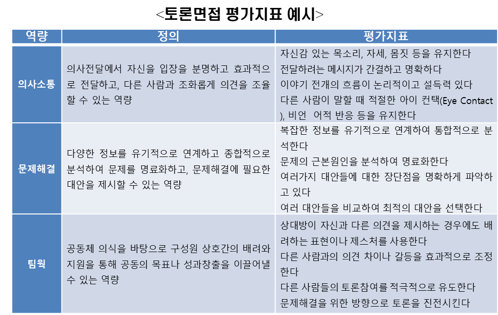 토론/토의면접은 이름 그대로 제시된 주제에 대해 지원자들 간에 토론하는 모습을 보고 평가하는 면접이다.