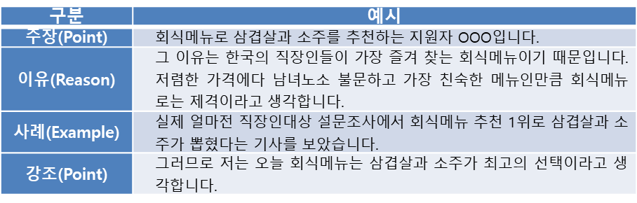 지원자는 저렴함과 친숙함을 이유로 들었고, 직장인 대상 설문조사 결과를 근거로 제시했다. 마지막으로 지원자는 “삼겹살과 소주가 최고의 선택이다”는 표현으로 살짝 바꿔 마무리함으로써 주장을 강조(Point)했다.