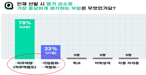 잡매칭 플랫폼 잡플렉스는 지난 9월 18일부터 21일까지 경영진 125명을 대상으로 <HR(채용&평가) 인식 설문조사>에서 ‘인재 선발 시 평가요소로 가장 중요하게 생각하는 부분은 무엇인가?’라는 질문에 응답자의 78%가 ‘직무역량(직무적합도)’를 꼽았다. 이어 22%가 ‘기업문화 적합도’라고 응답했다. 반면 학교·어학성적·각종 자격증을 선택한 이는 단 한 명도 없었다.
