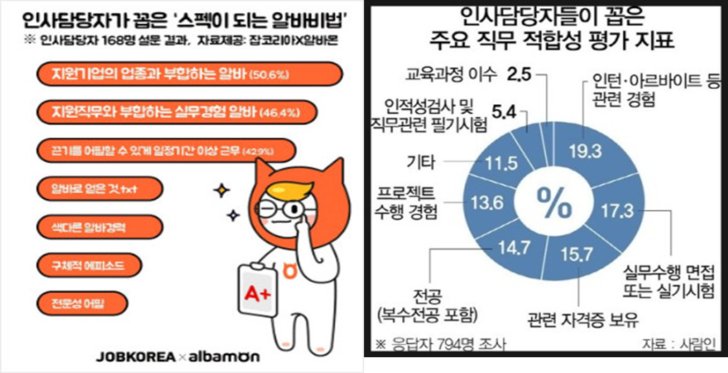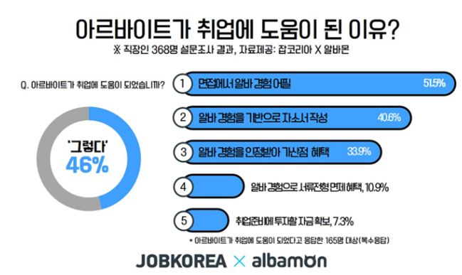 기업의 채용담당자들을 대상으로 “취업에 도움이 되는 방학활동”에 대해 의견을 물었더니 ‘인턴 등 실무경험’을 제외하면 ‘아르바이트’가 첫 손에 꼽혔다는 조사 결과가 이를 뒷받침한다.