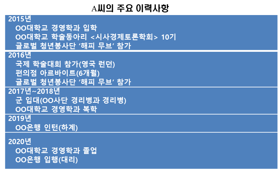 특히 대학교 입학 때부터 졸업(예정) 시점까지의 중요한 경험들을 빠뜨려서는 안 된다. 기업이 지원자를 평가할 때 가장 중요하게 생각하는 시기이기 때문이다.