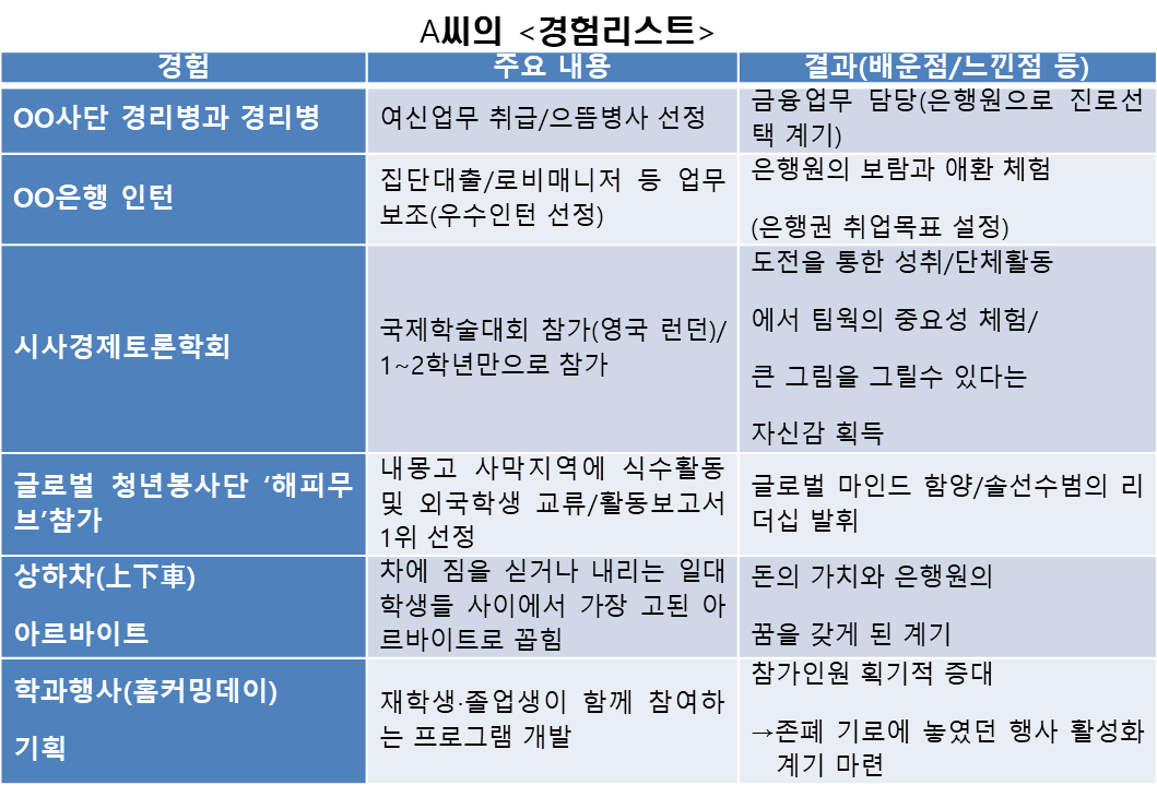 구체적으로 전공(수업)·자격증·인턴·아르바이트·어학연수(교환학생)·학회나 동아리 활동·봉사활동·대학생 기자단(서포터스) 활동·공모전 참가 등 교내/교외활동을 불문하고 지금까지의 중요한 경험들을 시간(흐름) 순·관련(직무) 역량별로 일목요연하게 정리한 <경험 리스트>를 만드는 일이다.