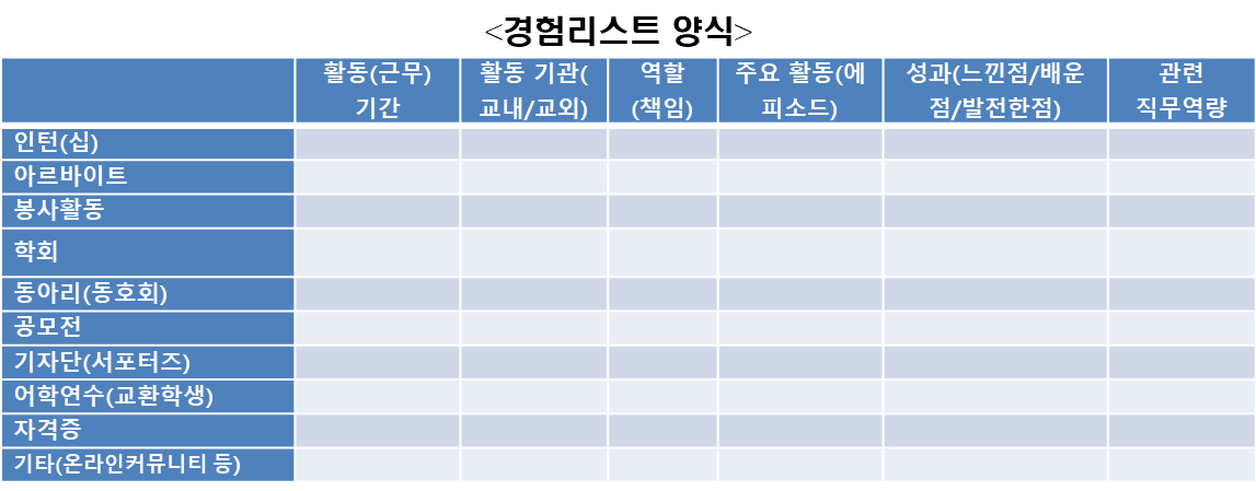 사실 <경험 리스트>의 주인공인 A 씨는 실존인물이 아니다. 필자가 여러 취업준비생들의 사례를 조합해서 만든 가공의 인물이다. A 씨의 사례를 참고해서 아래의 양식에 맞추어 각자 자신의 경험을 대입해서 정리해보면 된다.