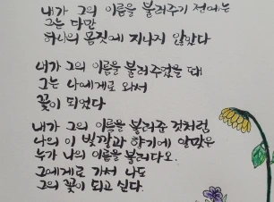 <탈무드>는 “이름보다 소중한 것은 없다”라고 말한다. “내가 그의 이름을 불러주기 전에는/그는 다만 하나의 몸짓에 지나지 않았다 /내가 그의 이름을 불러 주었을 때/그는 나에게로 와서/꽃이 되었다” 김춘수 시인의 <꽃>이다.